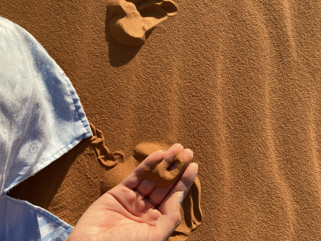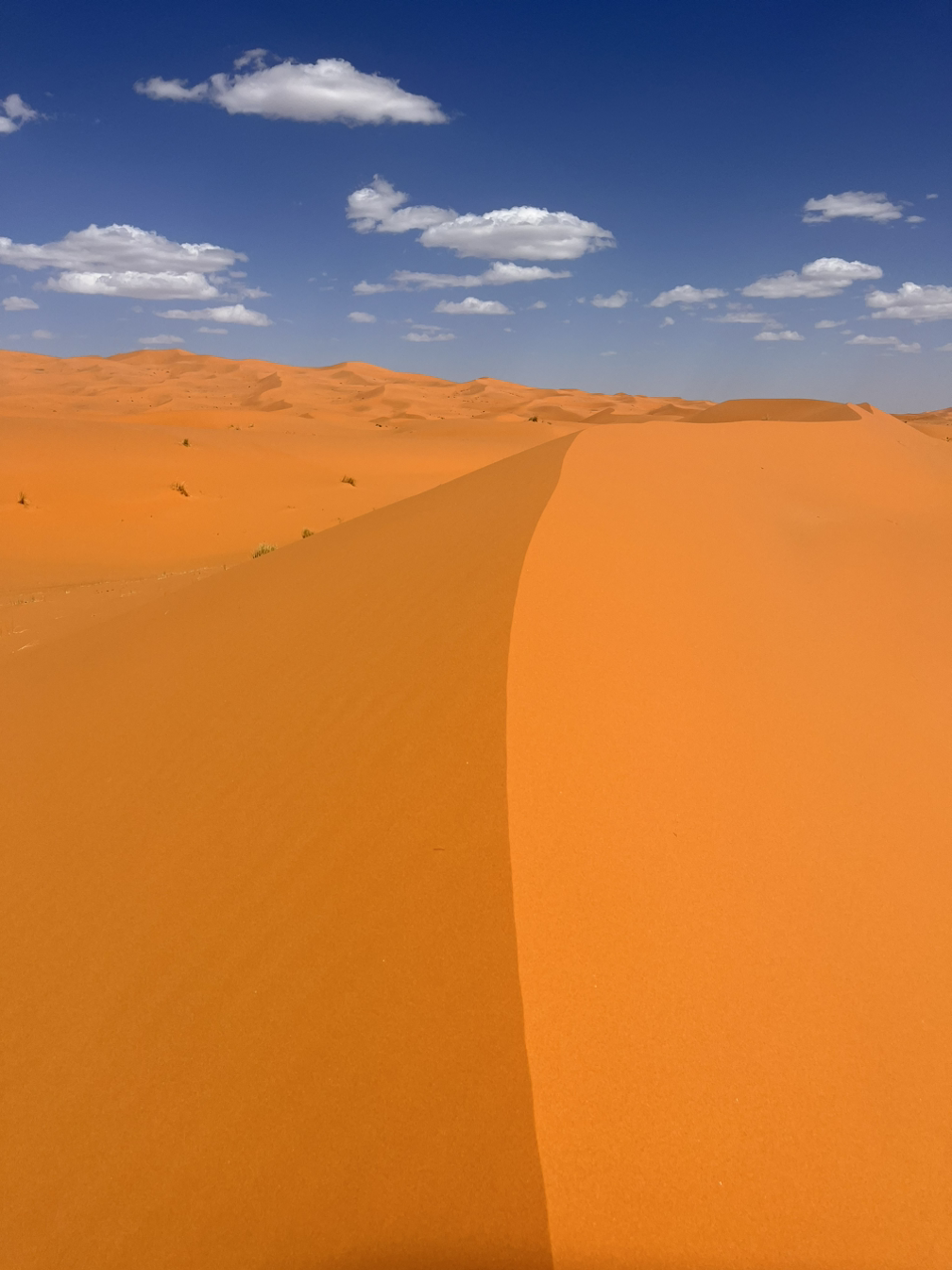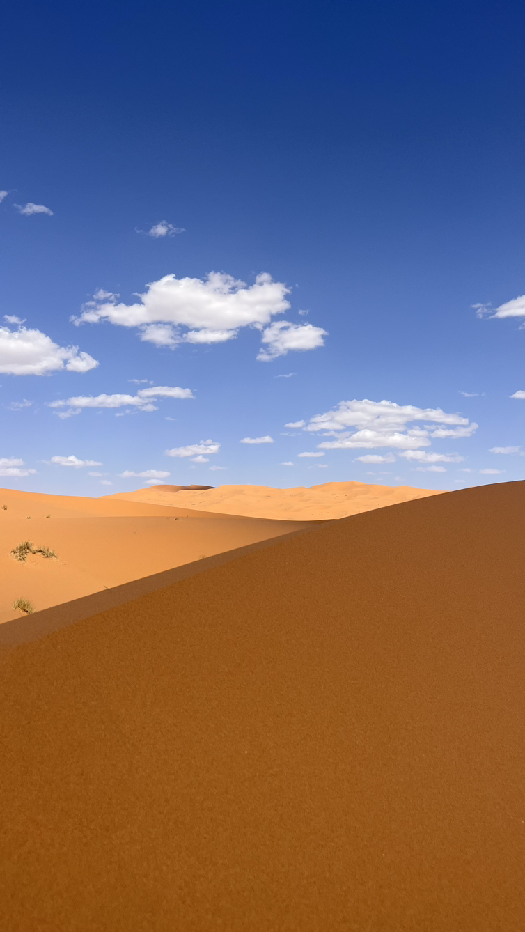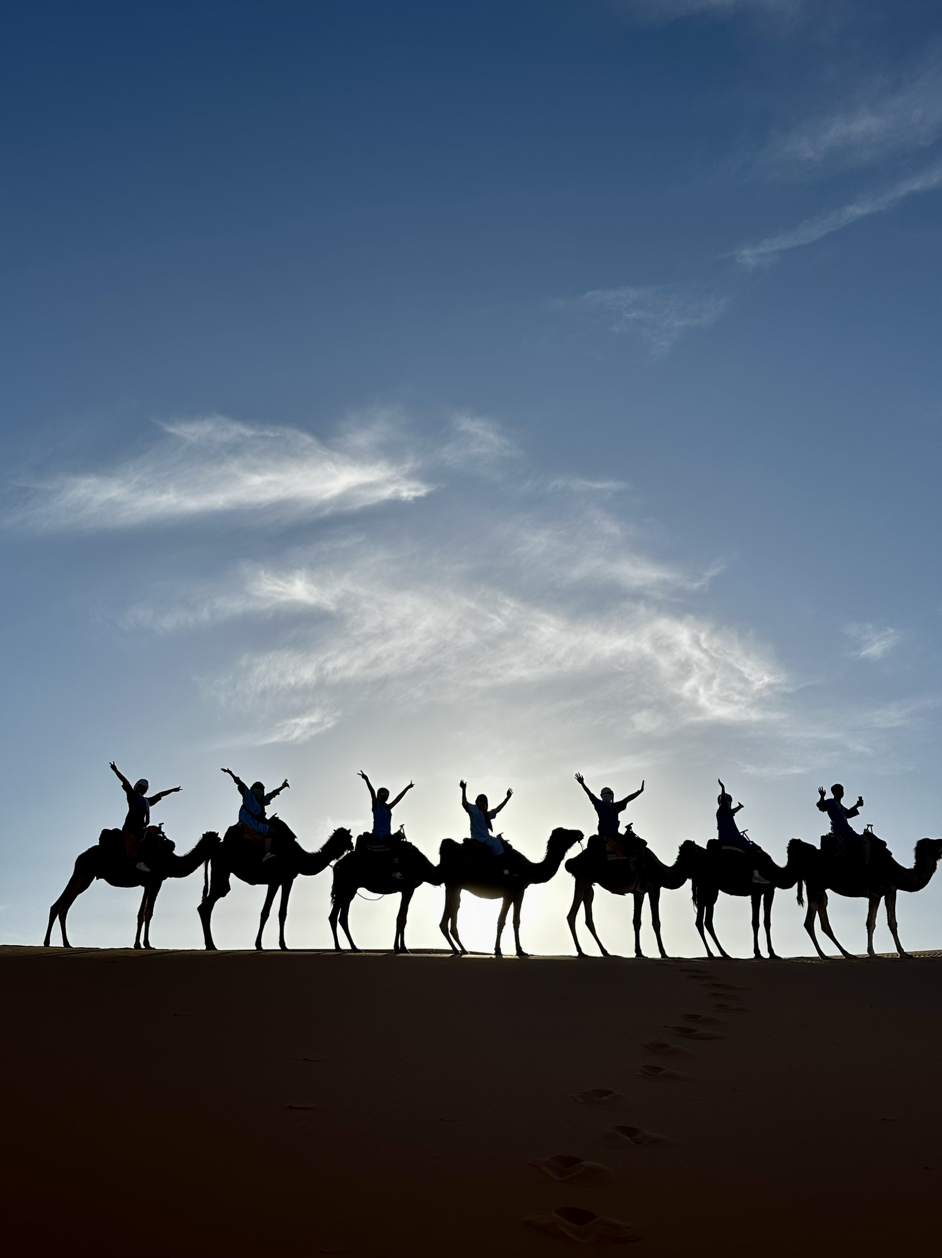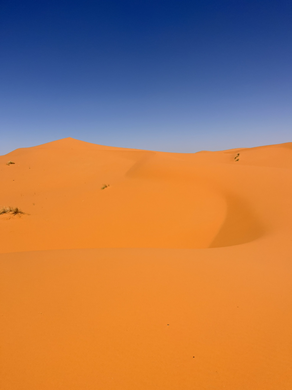 "낙타 마사지 끝. 낙타 힘들어."라는 능숙한 한국어를 선보인 한 베르베르인이 사막 선셋 포인트 앞에서 모든 낙타를 멈춰 세웠다. 어트랙션마냥 쉽지 않았던 첫 번째 낙타를 잠재우고 일몰에 반사된 황금빛 모래에 발을 내디뎠다. 푹 소리와 함께 두 발이 모래 언덕에 파묻혔다. 운동화를 신고 있었던 탓에 틈새로 가는 모래 입자가 스며들어오는 것이 느껴지자 재빠르게 양말까지 벗어던졌다. 한 걸음걸음을 걸을 때마다 모래가 밟힌다는 느낌보다는 주르륵 힘없이 주변으로 흘러내린다는 느낌이었는데, 이 텍스처가 영원히 남는 물자국 같아 보이기도 했다. 보고 느끼는 모든게 새로운 것 투성이었다.