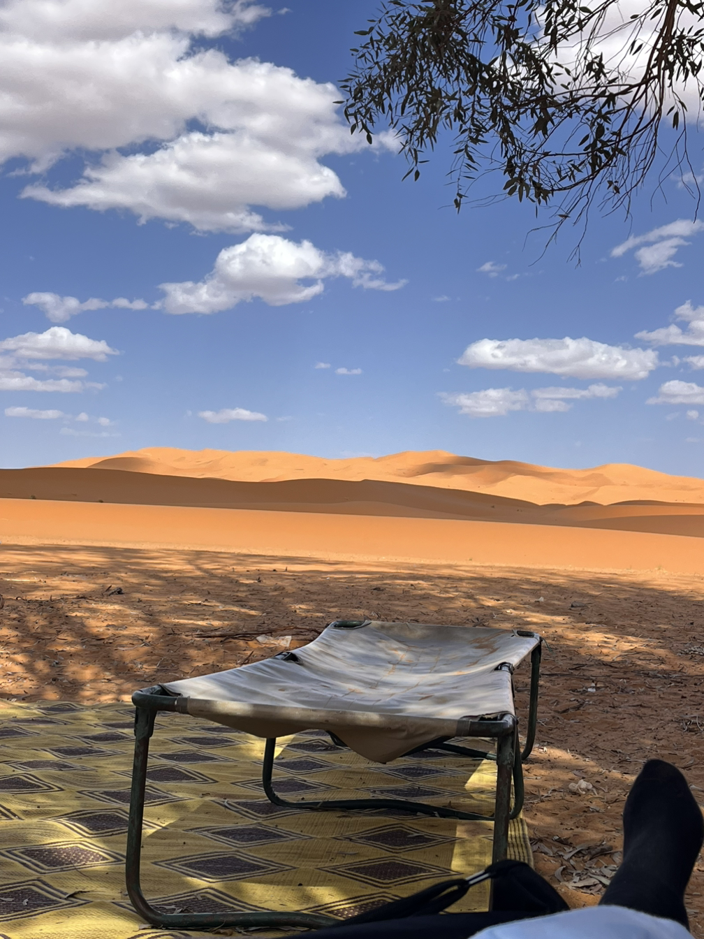 투어에서 만난 이들은 내게 체질인 것 같다는 농담을 건넬 만큼 낙타 타는 것이 무척 재밌었다. (낙타야 미안해) 사막의 풍경을 감상할 때는 가장 좋아하는 영화 OST 플레이리스트를 틀었고, 다른 사람들과 함께 음악을 감상하고자 할 때면 흥이 나는 힙합 노래를 틀었다. 고요한 자연 속에선 힙합이 전혀 어울리지 않을 것이라고 생각했는데, 낙타의 움직임에 맞춰 덜거덕거리던 우리의 몸짓과 얼마나 잘 어울리던지... 오아시스 앞에서 휴식을 취한 뒤 이번엔 또다시 사람들과 멀리 떨어져 홀로 알제리 국경선의 사하라를 누비기로 했다. 그렇게 몇 시간을 거대한 구름 아래 드리워진 사막 그늘에 누워 휴식을 취하고 양 옆 수직으로 펼쳐진 세상을 살피기도 했다. 물론 눈, 코, 입으로 사정없이 들어오던 모래입자들은 덤이었다. 그것마저도 모조리 낭만의 장치로 취급해 버릴 수 있을 만큼 행복했다.