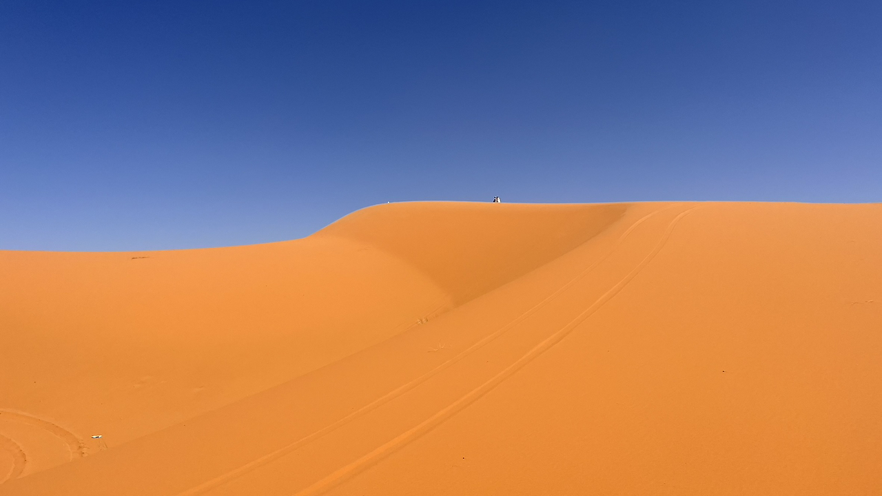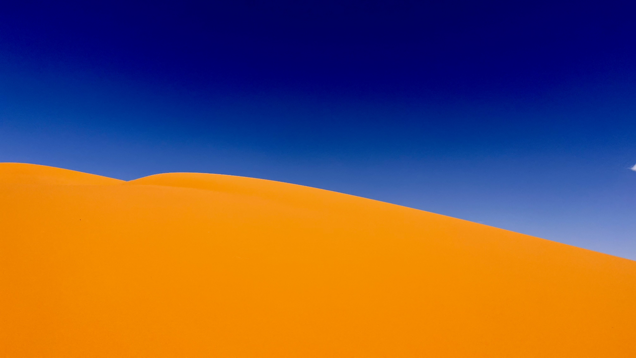 사막 유목민인 베르베르인들처럼 긴 스카프를 터번처럼 머리에 묶고 눈을 제외한 모든 곳을 가렸다. 바람이 가져온 가는 모래 입자들이 우리 몸의 구석구석을 침투하는 것을 최대한 방지하기 위하여. 그렇게 나는 알제리 국경선의 사하라 사막 오아시스까지 낙타를 타고 끝없이 이동했다. 이동하는 내내 본 주변 풍경이라곤 고요함 속 모래 언덕과 푸른 하늘뿐이었는데, 단순히 그곳을 두 단어로만 묘사하긴 아까웠다. 사하라 사막의 하늘은 구름 한 점 없이 맑았다. 컴퓨터 그림판을 켜놓고 마우스로 능선 하나를 그린 뒤 위에는 쨍한 하늘색을, 아래는 오렌지빛 황금색을 머금은 페인트통으로 칠해둔 것처럼 말이다. 클릭 세 번에 그림판으로 사하라 사막을 표현할 수 있을 것 같았다. 가끔 몽글한 구름이 우리 위를 지나가기도 했는데, 그럴 때면 허허벌판인 사막을 따라 베이지색부터 어두운 갈색으로 그림자가 드리워졌다. 그것마저도 어도비 일러스트레이터의 그라디언트 툴을 이용해 그라데이션을 표현한 느낌이었달까. 가장 자연적으로 형성된 풍경일 사막이 이렇게나 단순하고 인위적으로 보이다니, 그만큼 현실감이라곤 온데간데 찾아볼 수 없었다.