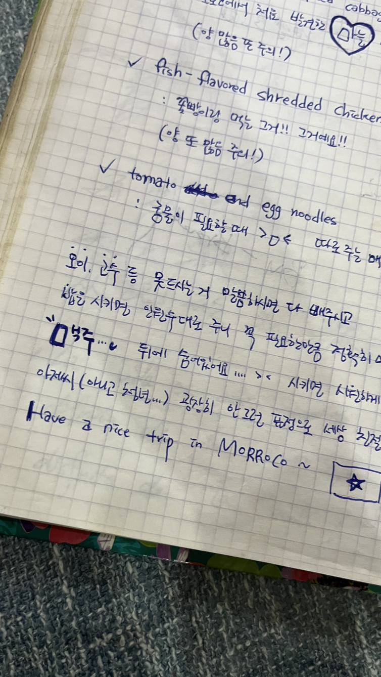 페즈는 내게 단호하고 냉정하면서도 그 안에 온기를 품고 살아갈 수 있는 방식을 가르쳤다. 말 그대로 강강약약. 페즈 여행 당시 ‘이드’ 첫날이었다. ‘이드’는 라마단 금식월이 끝나고 난 뒤 가족들끼리 즐기는 축제이다. 거리는 예상한 것보다 훨씬 많이 북적였고, 덕분에 잔뜩 긴장할 수밖에 없었다. 유튜브에서 보았던 일들의 연속이었지만, 그 상황을 어떻게 받아들이고 대처하는지에 따라 판도는 뒤집어졌다. ‘만약 모든 것을 의심하려 들면 결국 아무것도 의심하지 못한다’는 말을 돌아다니며 내내 곱씹었다. 난 이미 페즈에 와있고 이곳에서 3일 숙박을 할 예정인데, 그 모든 호의에 끝없는 의심만 하기 시작하면 여행이 재미없을 것 같았다. 그래서 그들의 문화 속에 스며들어 언어도 써보려고 노력하며 지냈고, 내 상식선에서 이해되지 않는 행동들은 정중하게 거절했다. 그러다 보니 페즈 이튿날부턴 주관을 잃지 않는 나만의 여행을 되찾을 수 있었다. 의외로 페즈에서 만난 모로칸들은 대부분 친절했다. 상인들은 민트잎을 한 움큼씩 손에 쥐어주며 본인의 무료 테라스로 와 최대 천연 염색공장을 구경하라고 했다. 길목에서 수많은 고양이들을 정신없이 쓰다듬고 있으면 건너편 메디나 상인분들은 “you like cats~?" 하며 흐뭇한 미소와 함께 윙크를 날리셨다. 아이들은 저 멀리서부터 한국인임을 눈치채고 빵긋 웃으며 내게 안녕하세요를 외쳤고, 낡은 골목 벽에 그려져 있는 BTS 낙서들은 왠지 모르게 애국심을 불러일으켰다.