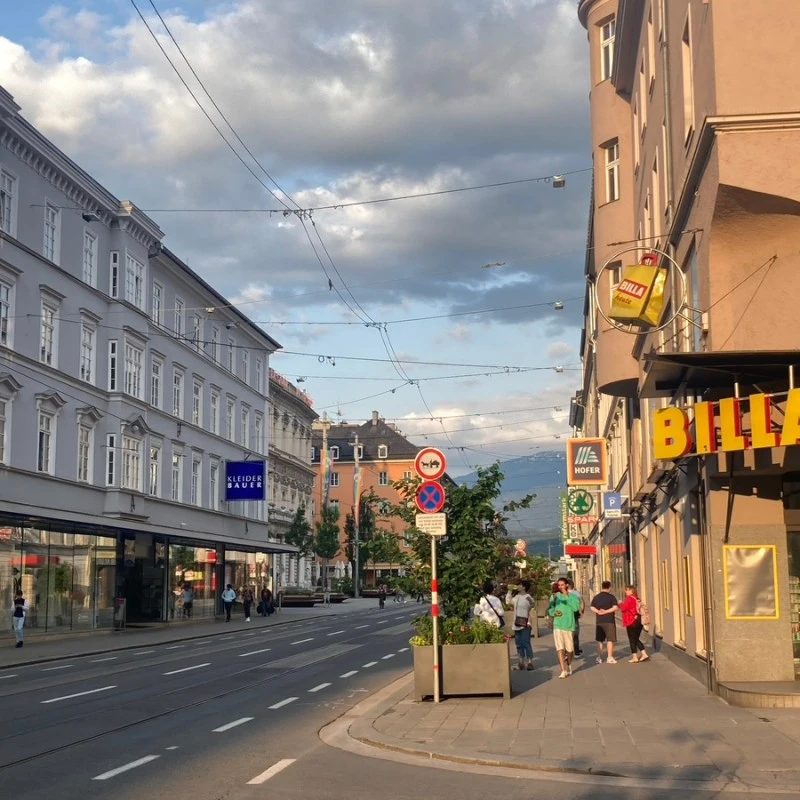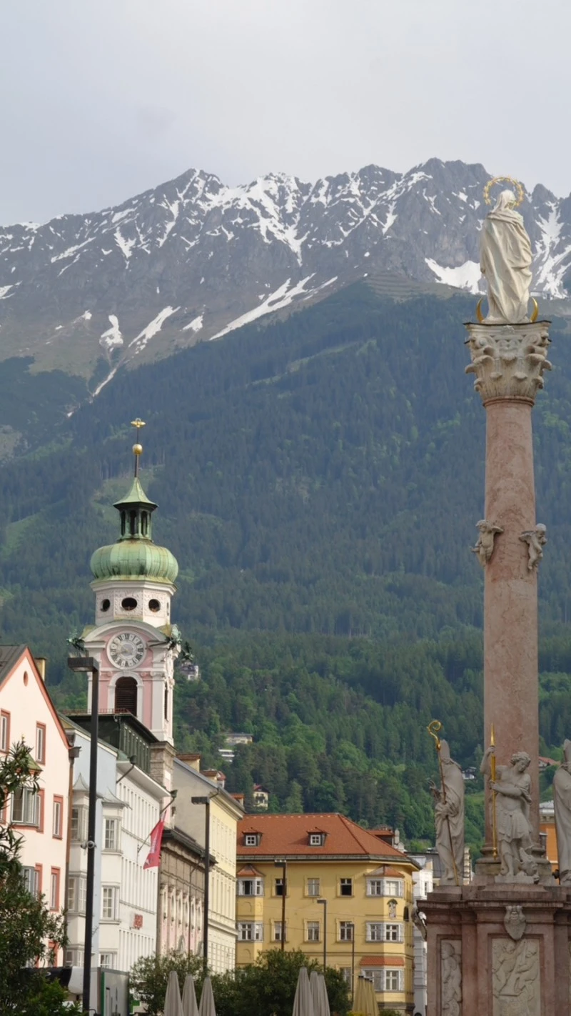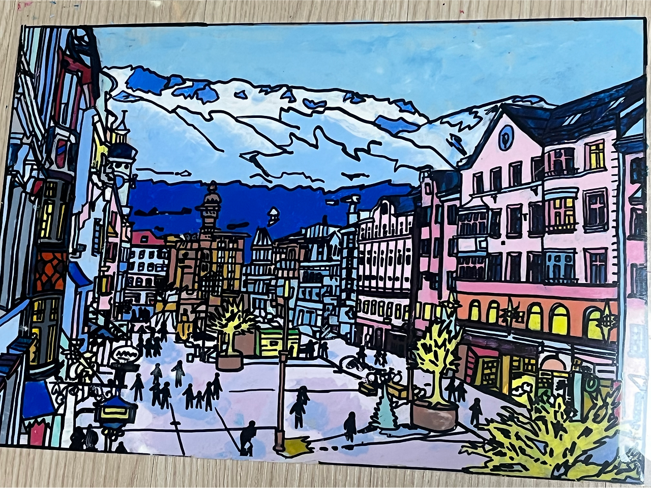 각설하고, 이 작고 소중한 도시인 인스부르크를 찾은 이유는 단 하나, 알프스 산맥을 보기 위함이었다. 절대 가성비 스위스를 생각하고 가지 않았다는 말을 한다면 거짓말이다. 인스부르크와의 인연은 중학교 미술 시간으로 거슬러 올라간다. 풍경 사진을 하나 뽑아와서 투명지 위에 마카를 대고 그린 다음, 뒤에 아크릴 물감을 색칠해서 깔끔한 스타일의 모방작을 만드는 것이 목표였다. 두 번째 미술시간 전 날 나는 인터넷에서 유럽 풍경을 검색했고, 알록달록한 유럽풍 건물들 사이로 펼쳐져 있는 알프스 산맥이 예뻐 보여 그걸 본뜨기로 했다. 당시 중학교 미술 선생님은 내 모방작을 보고 미술을 권유하기도 했었고, 엄마 역시 내 그림을 오랫동안 카톡 배경화면으로 지정해 두었었기 때문에 조금 의미가 남달랐다. 사실 그 사진들을 보고 '유럽엔 이렇게 근사한 곳이 있구나' 정도의 감상에서만 머물렀지 여기가 어느 나라인지, 어느 도시인지는 아예 몰랐다. 그러니까 인스부르크는 사실 이번 여행을 계획하다가 명확히 알게 된 도시였던 셈이다.