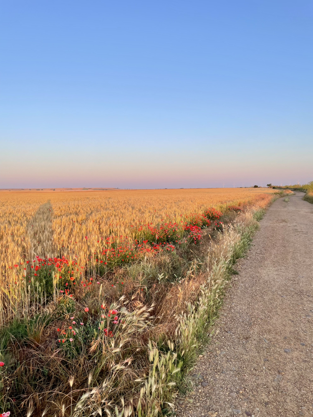 서쪽에 있는 콤포스텔라로 향해 가는 길엔 언제나 등 뒤로 해가 떠오른다. 지평선 위로 태양이 걸쳐져 있고, 드넓은 메세타 고원의 밀밭은 노란색에서 점점 주황색으로 변한다. 그러다 태양이 올라오면 온화한 볕이 한동안 함께한다. 잔잔한 바람까지 불어온다면 콧노래를 흥얼거리며 걷기 좋은 시간이다. 대부분의 순례자들은 이 시간에 더 빨리 걸어 많은 거리를 가려고 한다. 그러나 이 꿀 같은 시간의 향유를 놓칠 수는 없다. 사진 찍기에 최적인 빛과 아직은 화가 나지 않은 태양의 잔잔함을 즐기며 유유자적 걷는다.
