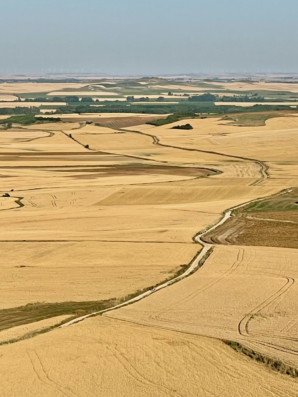 평원에 노랗게 익은 밀밭은 사막의 모래처럼 광활하다. 지평선이 보이는 곳은 아득히 먼 곳, 시야에 장애물이전혀 없다. 속이 다 시원해지는 평원 대부분의 길은 평지에 그늘이 없다. 한 마디로 드넓어서 속은 뻥 뚫리지만, 더위와 단조로운 길 덕에 속이 타들어간다. 마을 간의 간격도 넓어서 다음 마을이 나타나면 마치 사막의 오아시스처럼 반가움이 앞선다.