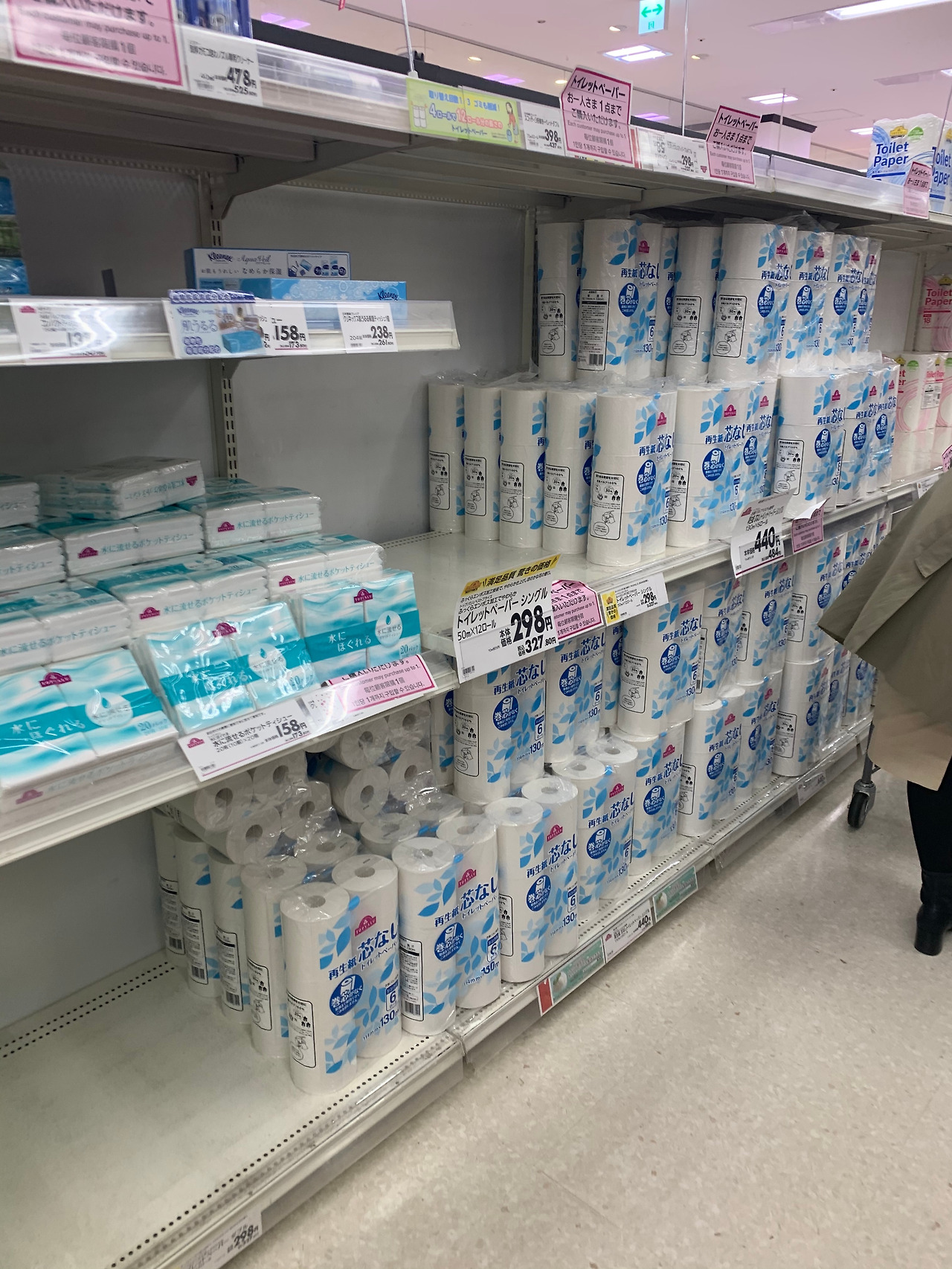 다행히 두루마리 휴지가 있다. 다만 두툼하고 질이 좋은 것들은 다 나가고, 그에 비해 조금 질이 낮은 제품만 남아있었다. 하지만 이 또한 이날만 그랬지 수일간은 정말 이 선반의 휴지 전체가 동이 났었다. (이 글을 쓰는 3월 23일, 이제는 많은 이들이 상황을 파악한 것인지 사재기를 멈췄고 두루마리 휴지는 여느 때와 같이 가득채워져 있다.) 다만 생리대는 여전히 일인당 한 개만 구매할 수 있도록 수량제한이 걸려 있었고 이는 현재시점에서도 여전히 동일하다. 전세계에 재난이 일어난 지금과 같은 시국에 왜 여성만이 어려움을 겪어야하는 것일까 또 한 번 화가 났다(그럼과 동시에 '면생리대'에 대한 생각을 잠시 해보기도 했다).