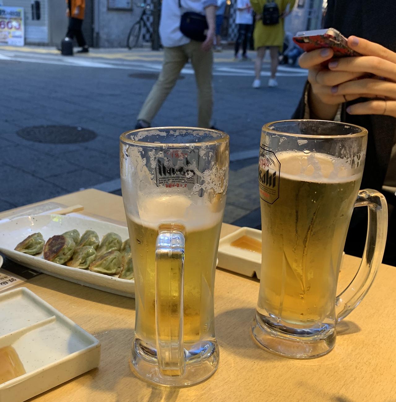 눈에 들어온 가게는 가게 앞에 테이블을 내놓은 가부키초의 한 교자가게였다. 어차피 안주는 많이 못 먹으니까 교자랑 같이 간단히 맥주 한 잔만 하자며 걸터앉은 것이... 그렇게 한 잔이 두 잔이 되고, 두 잔이 석 잔이 되고, 석 잔이 넉 잔을 넘어섰다. 진솔한 이야기가 끊임없이 퐁퐁 솟아났다. 눈물이 날 것도 같았다. 전광판이 번쩍번쩍하고 연인들이 길을 지나고, 식당 직원들이 호객을 하고, 이상한 사람들이 몇몇 지나가는 뒤로 하늘이 빨갛게 타오르다가, 파랗게, 그렇게 까맣게 밤이 되었다.