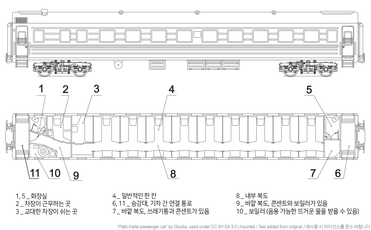 타게 된 기차는 005번으로, 등급은 3등석인 오픈된 쿠셋(Плацкартный, 플라츠카르트니, 3-сlass open sleeping)을 좌석으로 정했었다. 6인실이라고도 부르며, 한 칸에 2개의 2층 침대가 있고, 복도 쪽에도 1개의 2층 침대가 있는 구조이다. 원래는 2등석도 고려하긴 하였으나, 2등석은 객실마다 문 때문에 독립적인 공간을 구성하고 있어서, 횡단 열차의 민낯을 제대로 알기 힘들 것 같다는 판단에 3등석으로 하였다. 막상 들어가서 보니 그렇게 개방적이지도 않았고, 지낼만해 보였다.