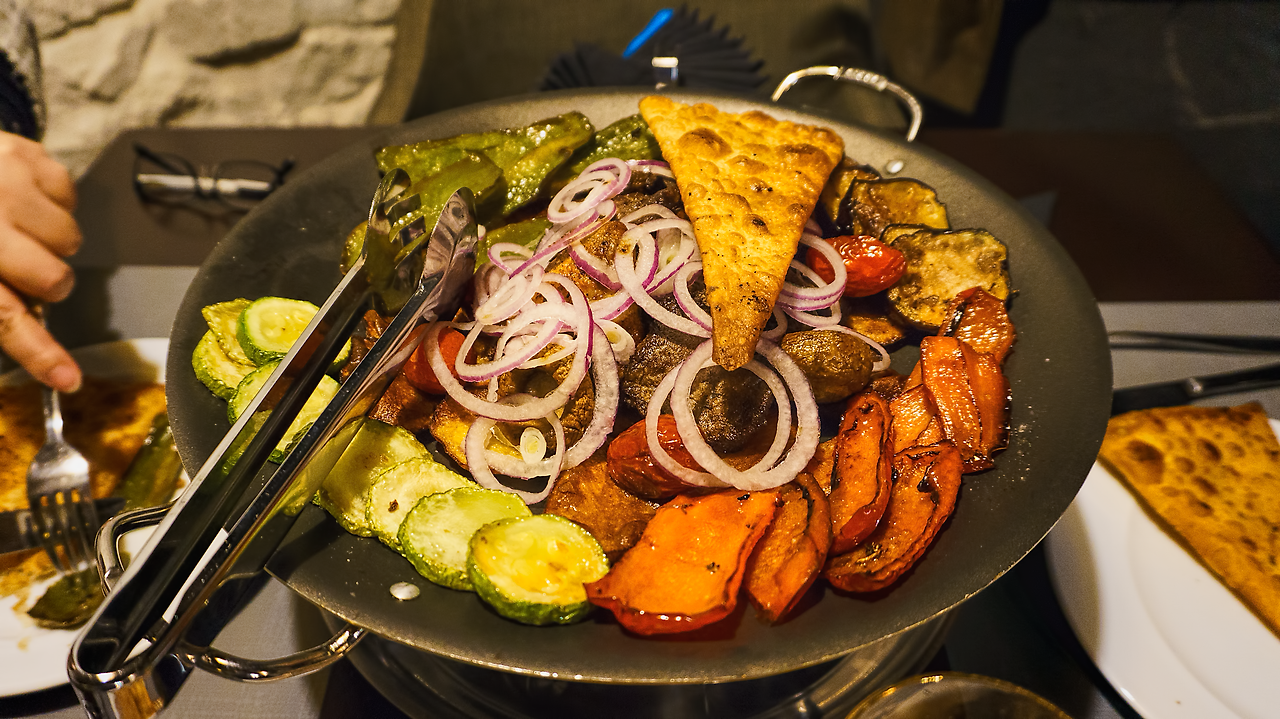 30분 정도 대화하고 맥주를 마시며 기다리니 음식이 나왔는데, 괜찮은 비주얼에 일단 놀랐고, 환상적인 채소의 익힘에 두 번 놀랐다. 개인적으로 가지나 피망이나 감자 같은 것들을 잘 구운 것을 좋아하는데, 정말 마음에 들게 나왔다. 특히 가지는 이렇게 요리하면 정말 맛있는 재료인데, 한국식 가지 요리는 왜 그런지 모르겠다. 다만 육류는 조금 퍼석한 느낌이었는데, 두께가 너무 가느다란 것이 문제인 것 같다. 그래도 적절하게 시즈닝이 되어 있어 맛은 있는 편이었다. 양의 경우에는 특유의 누린내가 거의 안 나는 편이었다. 유의할 점은 육류보다는 채소의 비중이 훨씬 높다는 것과, 많이 먹는 3명이서 이것만 먹으면 양이 조금 모자랄 수 있다는 점과, 채소구이에 흥미가 없다면 재미없는 음식일 것이라는 것 정도다.