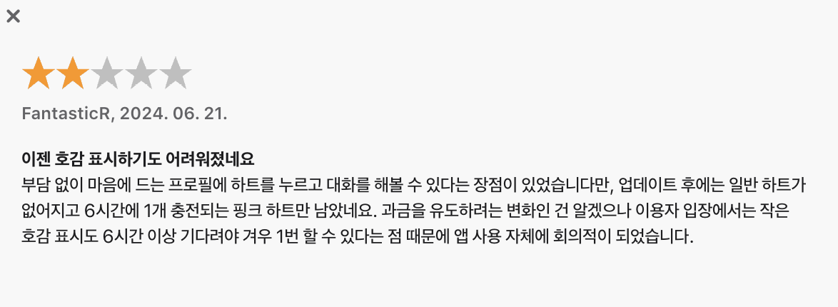 차라리 간단한 자기소개나, 자신의 성향, 좋아하는 것 등에 대한 질문을 보여주는 게 선택에 더 긍정적인 영향을 끼칠 것 같았어요. 포인트는 프로필을 처음 보았을 때 '이 사람을 더 알고 싶다 / 이 사람과 잘 맞을 것 같다'는 생각이 들지 않는 다는 게 현재의 아쉬운 점이었던 것 같아요.