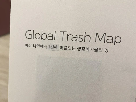 초반에는 ‘Trash Map’이라고 해서 우리나라와 세계의 쓰레기 배출량의 실태를 인포그래픽으로 보여준다. 톤 단위의 어마어마한 숫자들을 보고있으면 한숨이 나온다.