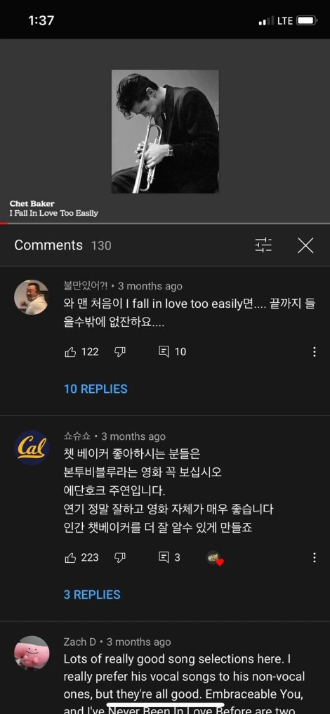 내 유튜브 알고리즘이 좋아하는 종목 중 하나는 플레이리스트인데, 쳇 베이커가 뜨길래 들어가봤다. 이전에 '쳇 베이커 음악은 아름답지만, 그의 허무주의적인 사상이 진하게 묻어있어서 오래 들으면 위험하다'라는 내용의 댓글을 봐서 왠지 3분 이상 못 듣겠지만 궁금하기는한 쳇 베이커. 마치 선악과와 같은 느낌이랄까. 본투비블루를 꼭 추천하길래 일단 캡쳐를 해 놓았으나, 아마 사진첩 속 많은 책 표지들처럼 이 영화 역시 안 볼 가능성 99.9%... 재알못이라 죄송합니다.