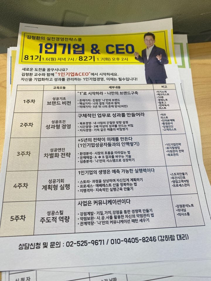 나 역시도 '1인 기업'에 관심이 많았기에 김형환 교수님 강의를 엿들으면서(?) 많은 영감과 통찰력을 얻을 수 있었다.