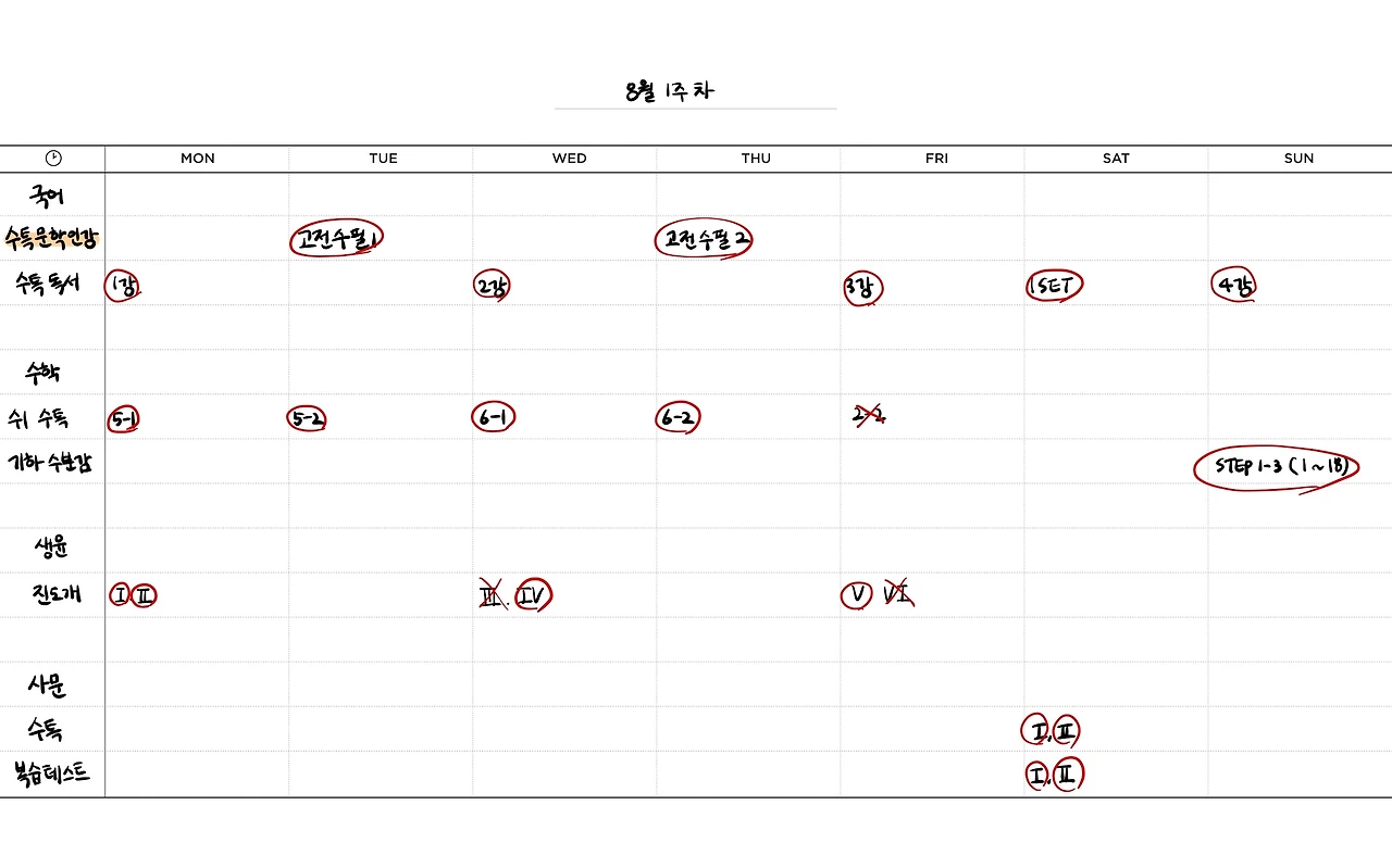 수학 수1 수특은 사무실에서 끝까지 풀었고 앞에서 안 푼 2단원 지수 로그함수가 몇 문제 남았는데 회사 일이 바빠 못 풀었다. 다음 주에 수1 수특을 끝내고 수2 수특에 들어갈 예정이다. 기하 수분감은 계획대로 풀었고 다음 주면 초고난도 빼고는 모두 끝내게 된다.