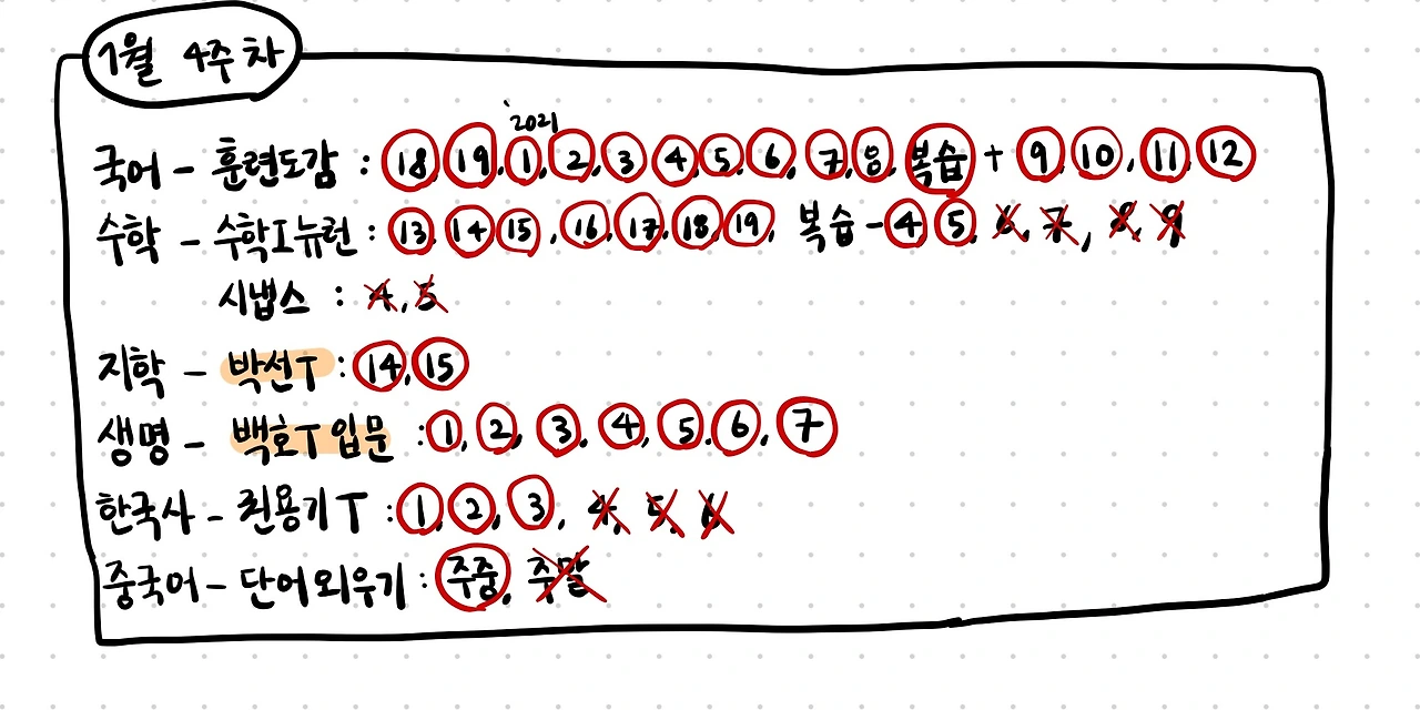 넷플릭스를 끊고 공부 시간이 확실히 늘었다. 이번 주는 특히나 공부 시간이 길었는데 그럼에도 목표 분량을 못한 게 있어 너무 아쉽다.. 수학에 시간이 이렇게 많이 소모되는지 몰랐었다 ㅜㅜ 아직 수학 I인데... 이번 주 못다 한 것들이 더 밀리지 않게 다음 주에 휴가를 하루 내야겠다.