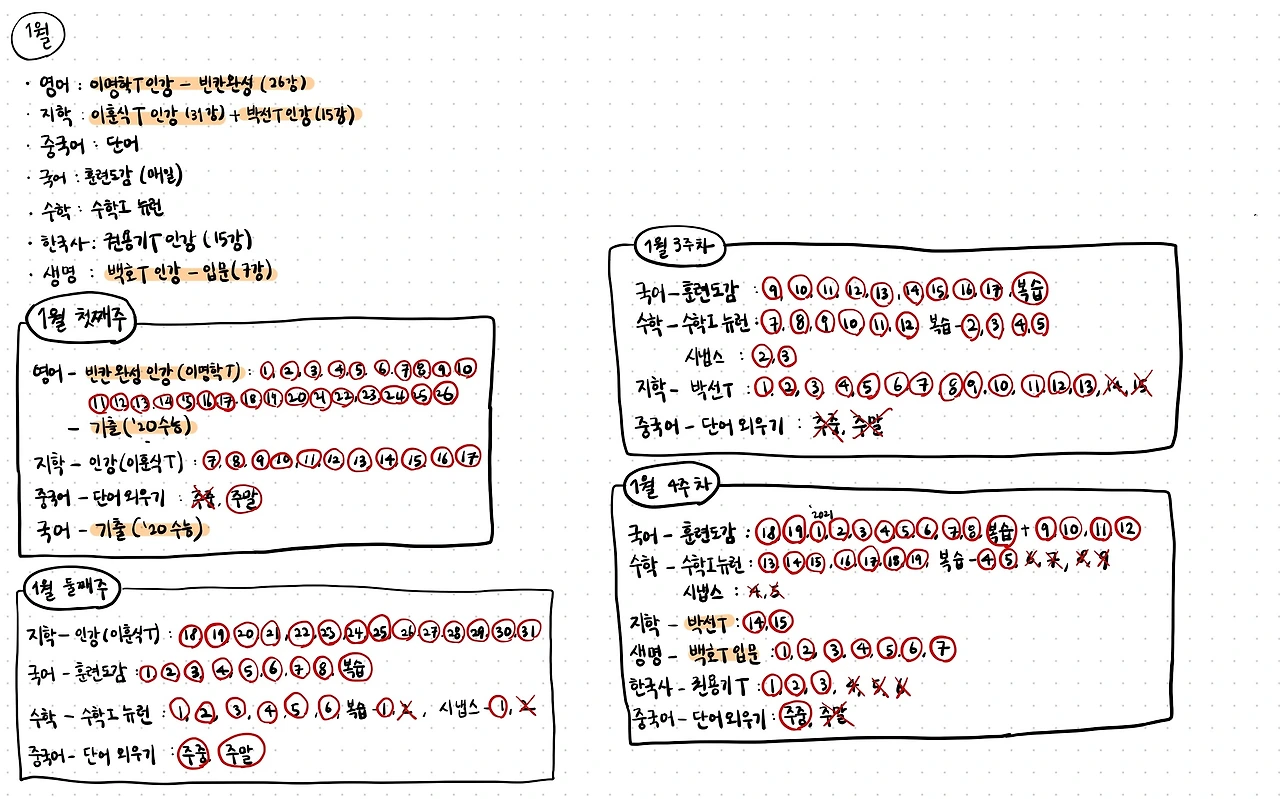 요즘 학생들은 ‘커리 탄다’라는 표현을 쓰던데 이건 한 강사님의 커리큘럼을 따른다는 뜻이다. 한 강사가 1년 치 학습 커리큘럼을 만들어 12월 말이나 1월 초부터 개념 설명 강의를 하고 그 뒤로 심화 강의나 기출 풀이 강의, EBS 연계 교재에 대한 강의 그리고 마지막으로 수능 직전 실전 모의고사까지 제공한다. 여러 강사의 강의를 섞어 들을 수도 있겠지만 특정한 스킬을 요구하는 과목은 일관성을 위해 한 강사의 커리큘럼을 따르는 게 좋다는 거 같다. 강사마다 수업 방식이나 분위기, 문제에 접근하는 방식이 달라서 OT 강의나 예시 강의 등을 보며 선택하기도 한다. 나도 1년 치 인강 커리큘럼을 계획해봤다.