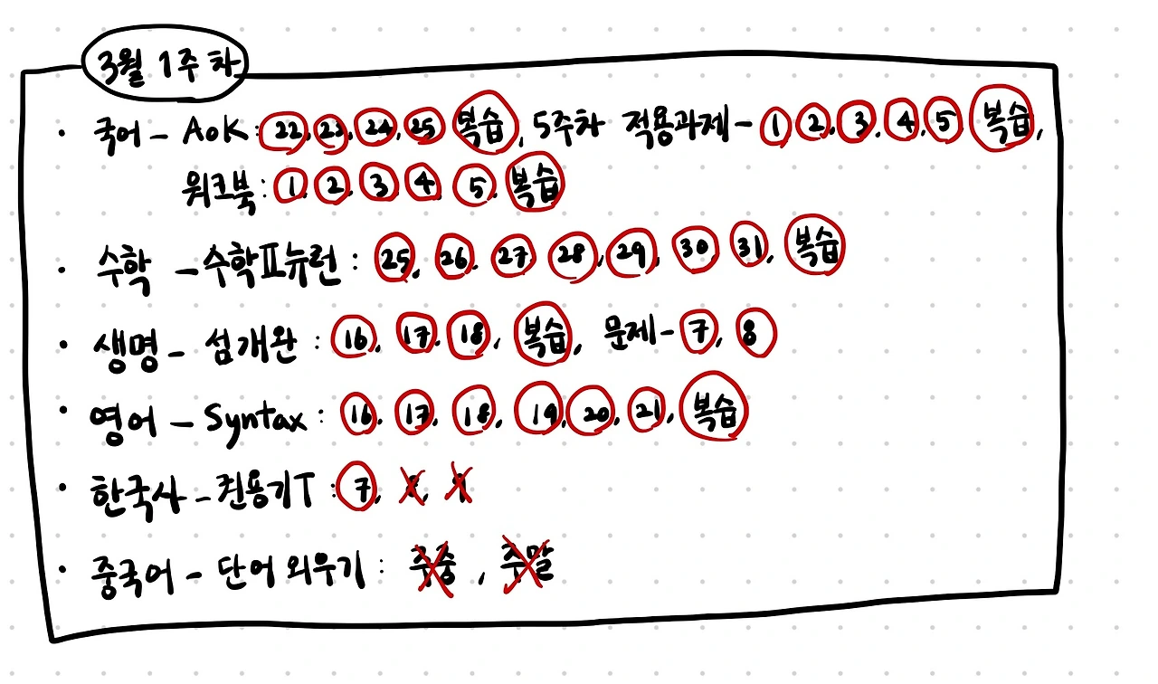 이번 주 월요일은 너무 피곤하고 무기력해서 낮잠도 자고 공부를 쉬었다. 화요일부턴 정신 차리긴 했는데 이렇게 몸이 피곤한 날이 가끔씩 오는 거 같다. 화요일엔 오후 반차를 냈으나 미용실 갔다 오니 저녁이어서 공부를 많이 못했다. 토요일엔 스터디 모임에 나가서 꽤 오래 공부했고 일요일엔 오후 약속이 있어서 오전에만 집에서 공부를 했다. 3월에는 거의 매주 주말 약속이 있어서 공부를 많이 못할 거 같다. 3월엔 평가원 출제는 아니지만 모의고사가 있어서 나도 하루 휴가 내고 도서관 가서 시험 시간을 맞춰 전 과목을 풀어볼까도 고민 중이다.