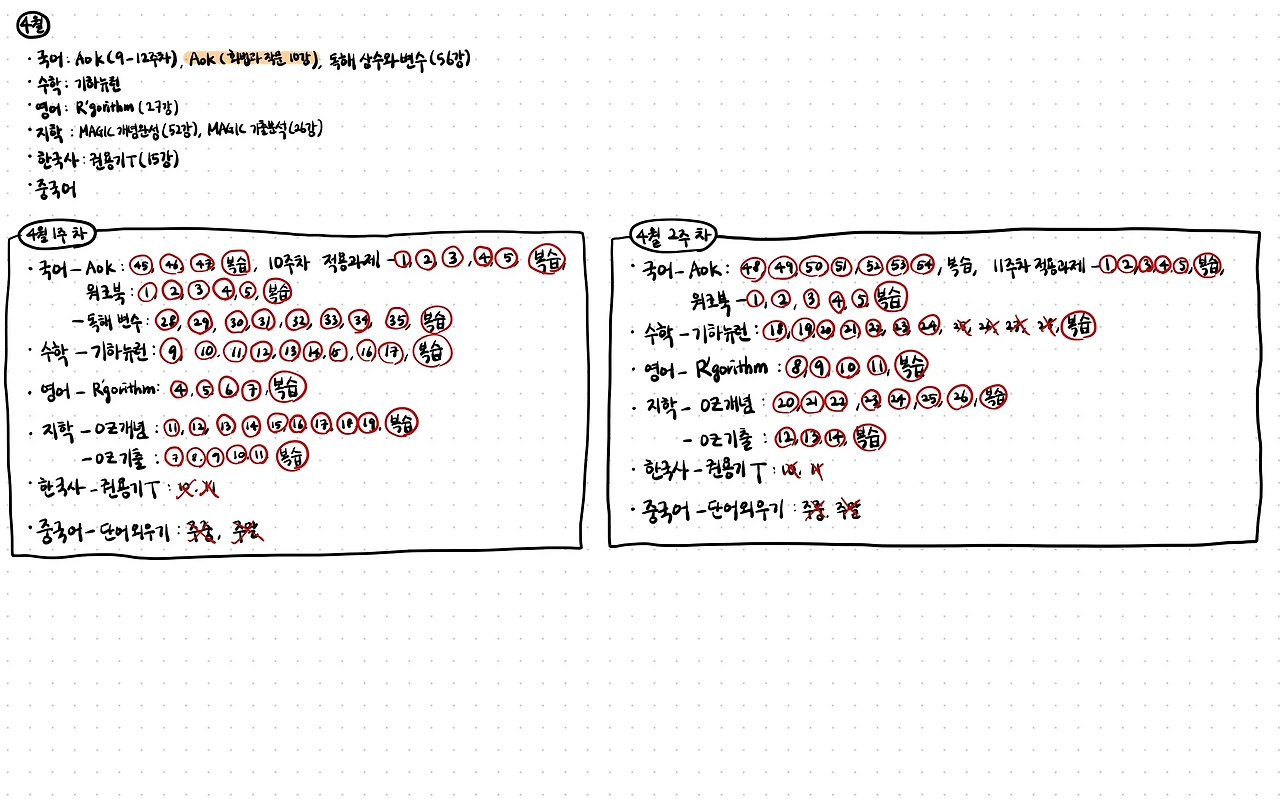 4월 : 국어(Aok, 독해 상수와 변수), 기하(뉴런), 영어(R'gorithm), 지학 I(MAGIC 개념완성, MAGIC 기출 분석), 한국사