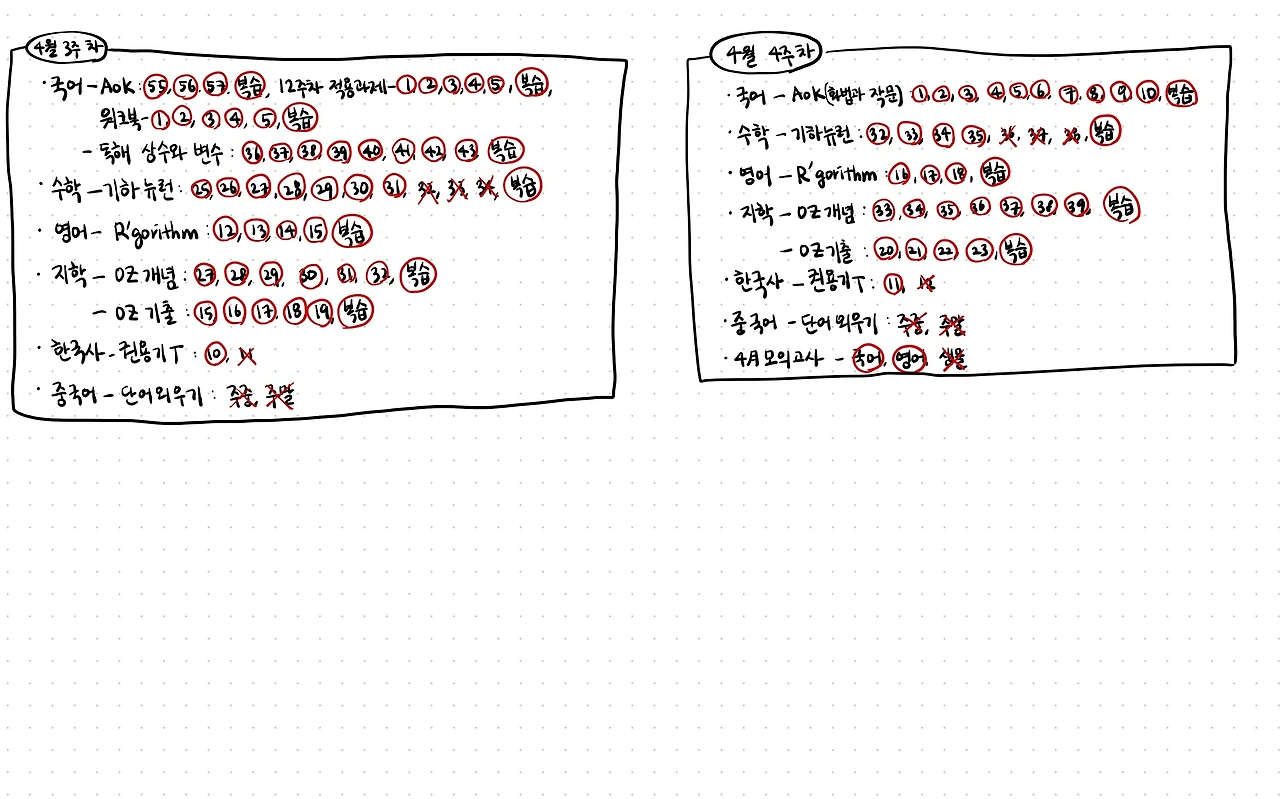 공부 계획에서 크게 어긋낫던 적도 없고 5월까지 모두 마무리할 거 같다. 다만 5월이 지나면 6모인데 그걸 대비해 벌써 인강 강사들은 실전 모의고사 강의를 내놓았다는 거다. 왠지 내가 많이 뒤처진 기분 ㅠ 휘둘리지 말고 내 페이스대로 천천히 공부해가야지라고 마음은 먹지만 자꾸만 흔들린다.