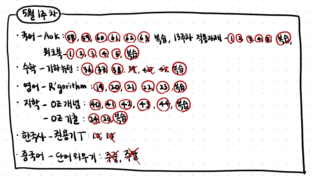 한국사와 중국어는 이번 주는 스킵. 다음 주는 공휴일도 있으니 힘내자!