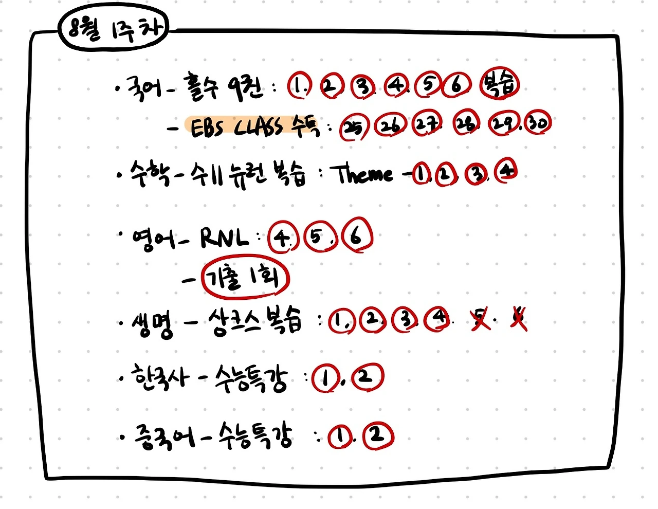 국어 홀수 문제집은 9권 과학기술까지 독서편을 모두 끝냈다. 역시나 과학기술이 탈탈 털리는데 차라리 그걸 감안해서 과학기술은 천천히 풀고 정답률을 높이게 하는 게 나을 거 같다. 문학 부분이나 내가 자신 있어하는 독서의 인문예술에서 시간을 줄이고… 점점 시험 스킬도 만들어 가고 있다. 다음 주부터 2주 동안은 홀수 화작을 풀 예정이다. 김동욱t EBS CLASS 수특은 30강 완강을 했다. 6강의씩 5주간 들었는데 연계 교재에 나오는 문학 작품들을 한번 더 볼 수 있어서 좋았다. 수능완성 교재도 강의가 나오면 들을 예정이다. 김동욱t 나랑 넘 잘 맞는 듯…