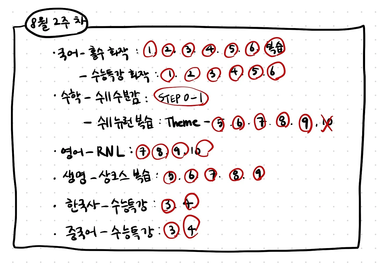 백신 후유증도 없었고 이번 주는 꽤 공부를 많이 했다. 국어가 화작 공부 중이라 여유로운데 그걸 생명 상크스가 채워줌.. 생명 고난도 문제 풀 때마다 탈모 오는 기분이다.. 다음 주도 힘내자!