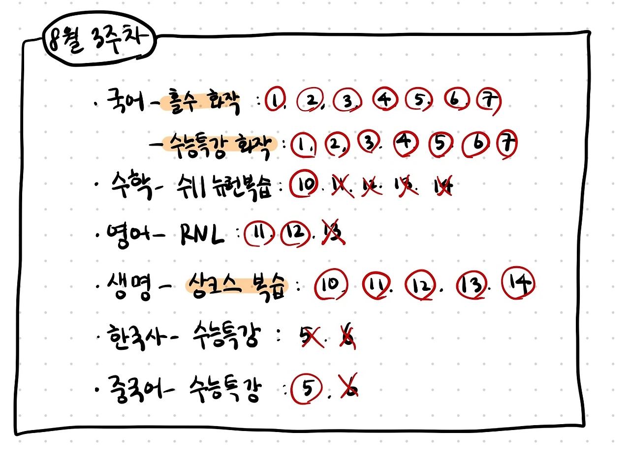 이번 주는 예상대로 회사 기술 교육 때문에 공부를 정말 정말 못했다. 교육이 너무 힘들어서 끝나면 드러누워 한숨 자야 했다. 주말엔 오랜만에 외식을 했는데 몸이 안 좋아져서 주말에도 못했고… 그래도 화작 공부랑 상크스 복습은 끝내서 다음 주부터는 새로운 공부를 시작할 예정!