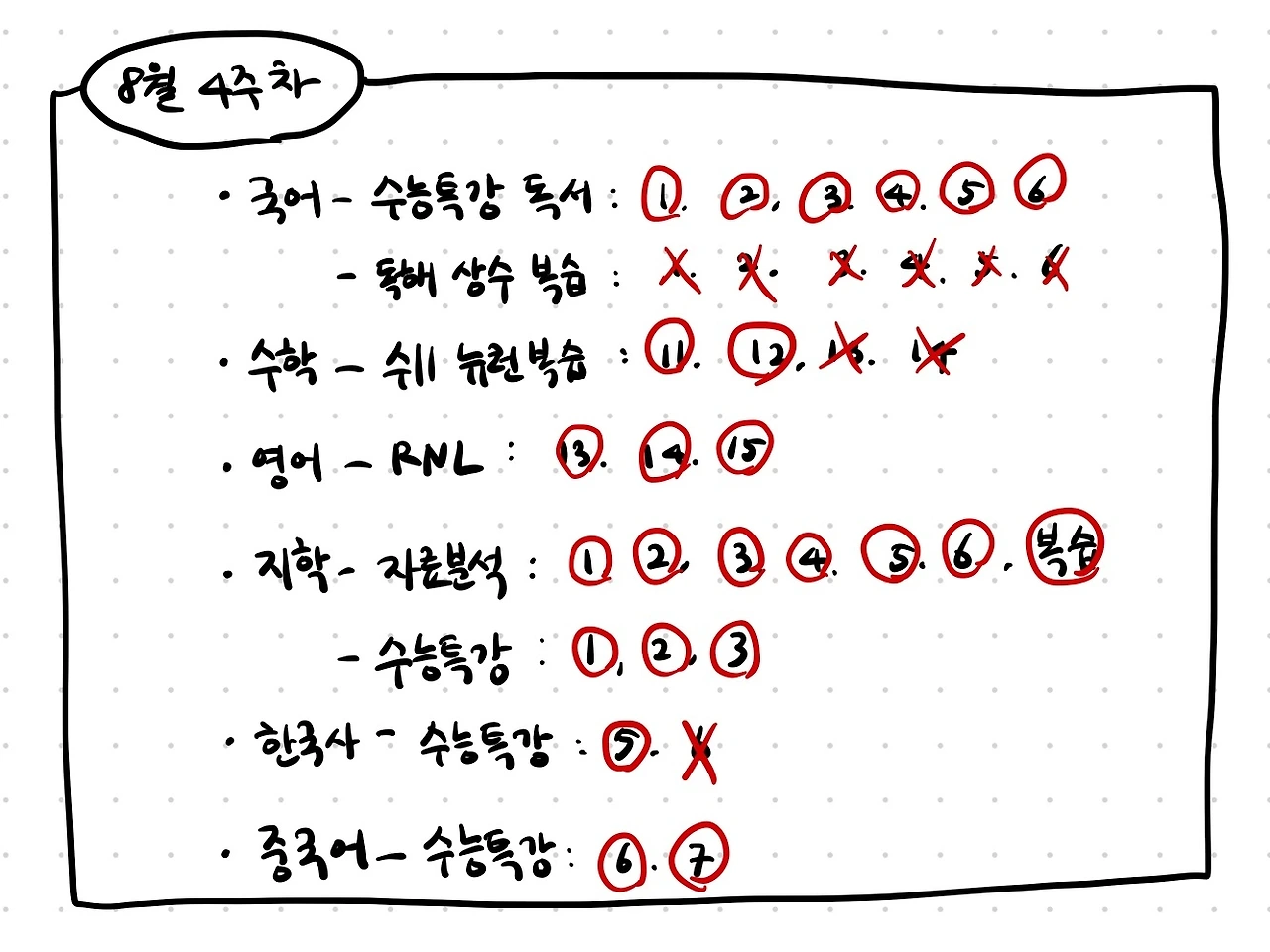 국어 수능특강 독서를 시작했다. 하루에 3 지문씩 푸는데 기출문제와 비교했을 때 너무 어렵다… 최소 두 번은 봐야 할 거 같은데 생각만 해도 어렵네. 그리고 같이 독해 상수와 변수 복습을 하려고 했는데 이번 주는 시간이 없어서 아예 스킵했다. 다음 주부터는 같이 해야겠다.