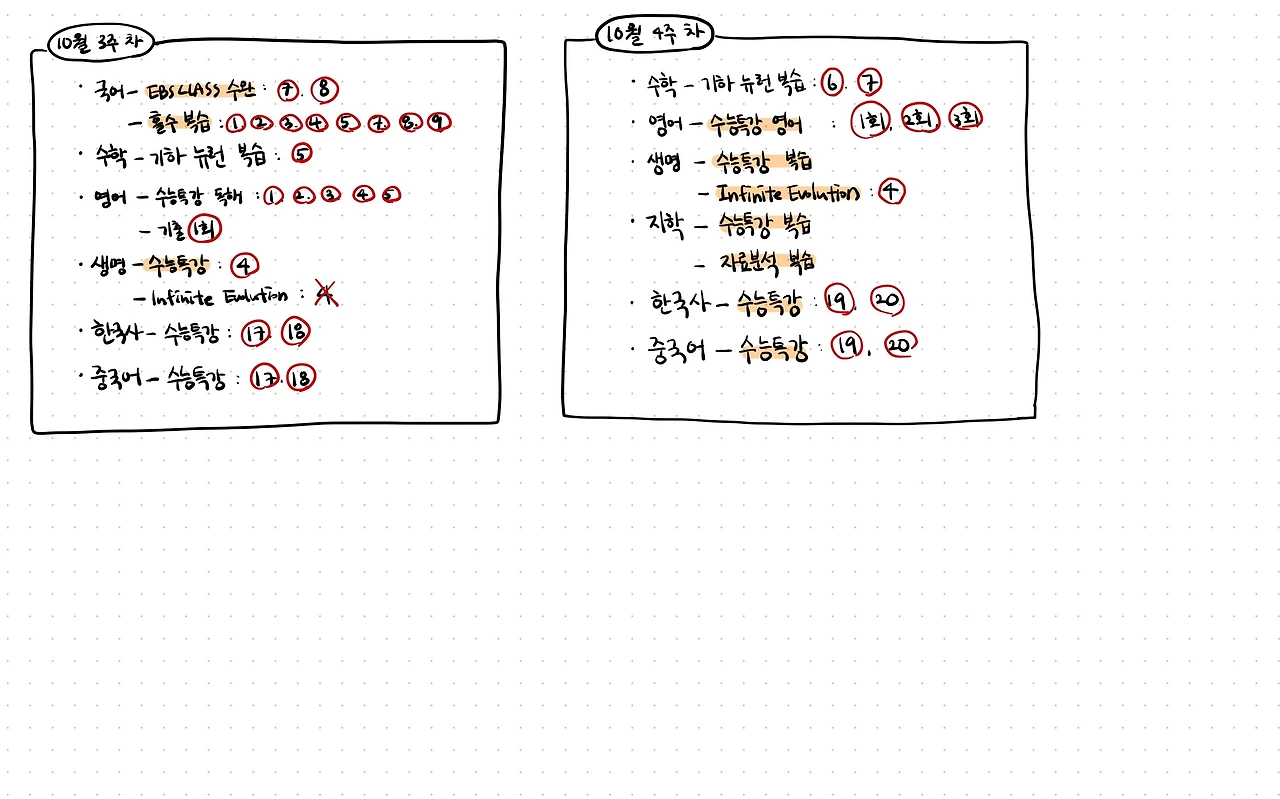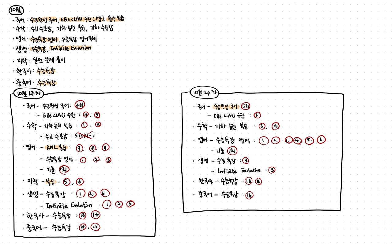 10월 : 국어(수능완성 국어, EBS CLASS 수완), 수학(수분감), 기하(뉴런 복습), 영어(수능특강 영어, 수능특강 영어 독해), 생명(Infinite Evolution), 한국사(수능특강), 중국어(수능특강)
