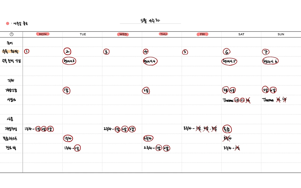 저번 주까지 신나게 놀았으니 이번 주는 본격적으로 공부를 하려고 했는데 4일이나 출근을 했다. 죽는 줄 ㅠㅠ 회사에서 내내 앉아있다가 집에 와서도 앉아서 공부하려니 다리가 저렸다. 그래도 열심히 토요일에는 스터디 모임에 갔고 일요일엔 도서관에 가서 공부했다.