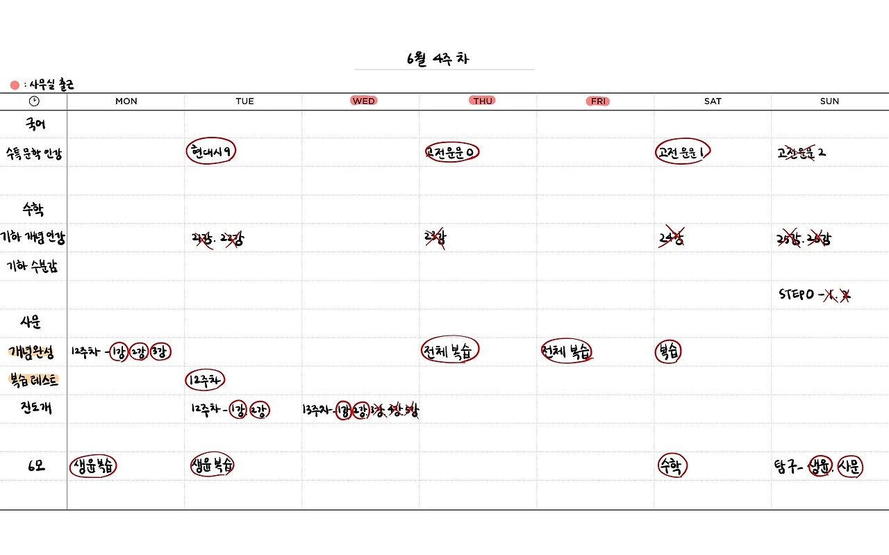 이번 주는 주말에 6모 수학, 탐구를 풀기로 해서 긴장한 채 보냈다. 토요일엔 스터디 모임에 나갔고 일요일엔 도서관에 가서 공부했다. 다음 주 월욜까지 재택이고 화욜부터 다음 달까지 풀 출근이라.. 당분간 공부를 제대로 할 수 있을지 의문 ㅠㅠ