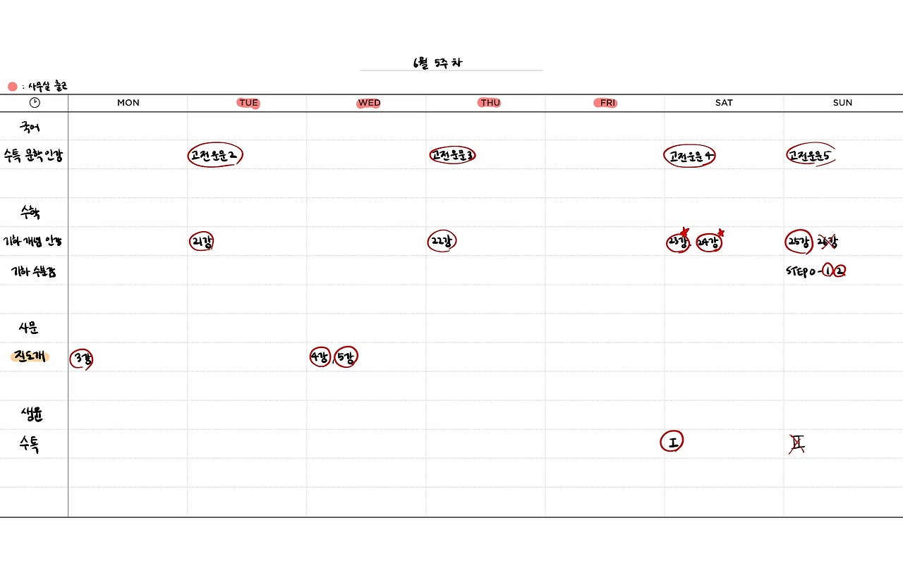 컨디션 조절할 겸 이번 주는 널널이 공부했다. 공부 계획표엔 안 적었는데 독서 지문을 거의 매일 읽었다. 국어 공부 방법 영상을 보다가 이지영t가 말하신 걸 봤는데 독서 문제를 풀 때 지문-문제 왔다 갔다 안 하고 지문을 100% 이해하고 문제를 그다음에 푸는 방법을 얘기하셨는데 국어는 정말 그렇게 해야 하는 거 같아 어려운 지문을 꾹 참고 읽는 연습을 하기 시작했다. 독해력이 뛰어난 애들은 지문에 밑줄도 안긋고 푼다는데 나는 거기까진 안 되지만.. 새로운 방법을 적용해 보는 걸로 만족! 이번 주도 토요일엔 스터디 모임에 나갔고 일요일에 도서관에 가서 공부했다.