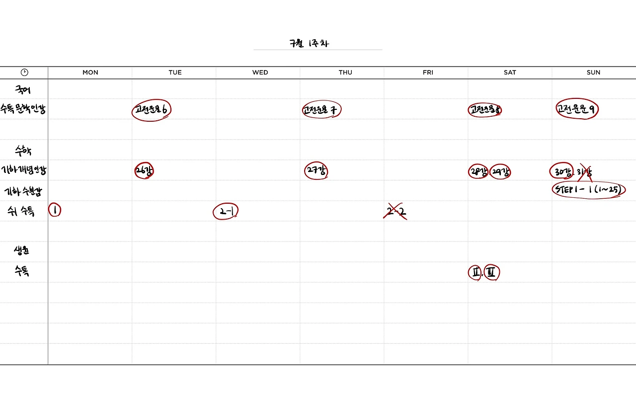 국어 김민정t 수특 인강은 계획대로 들었다. 고전시가 너무 어렵 ㅠㅠ 김승리t 독서 문제집도 한 권을 복습했다.