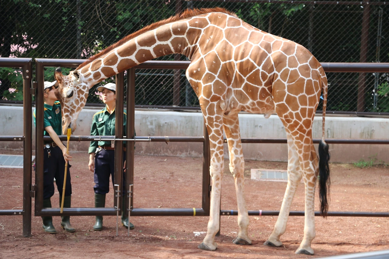 한 사육사가 타겟(훈련을 위한 긴 막대기)을 가지고 기린의 경정맥에서 피를 뽑는 훈련을 하는 중이었다. (이를 긍정강화훈련이라고 한다)