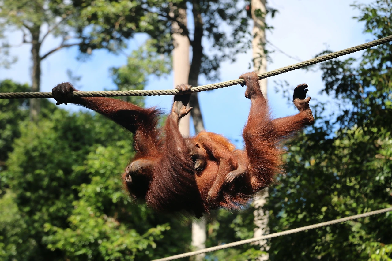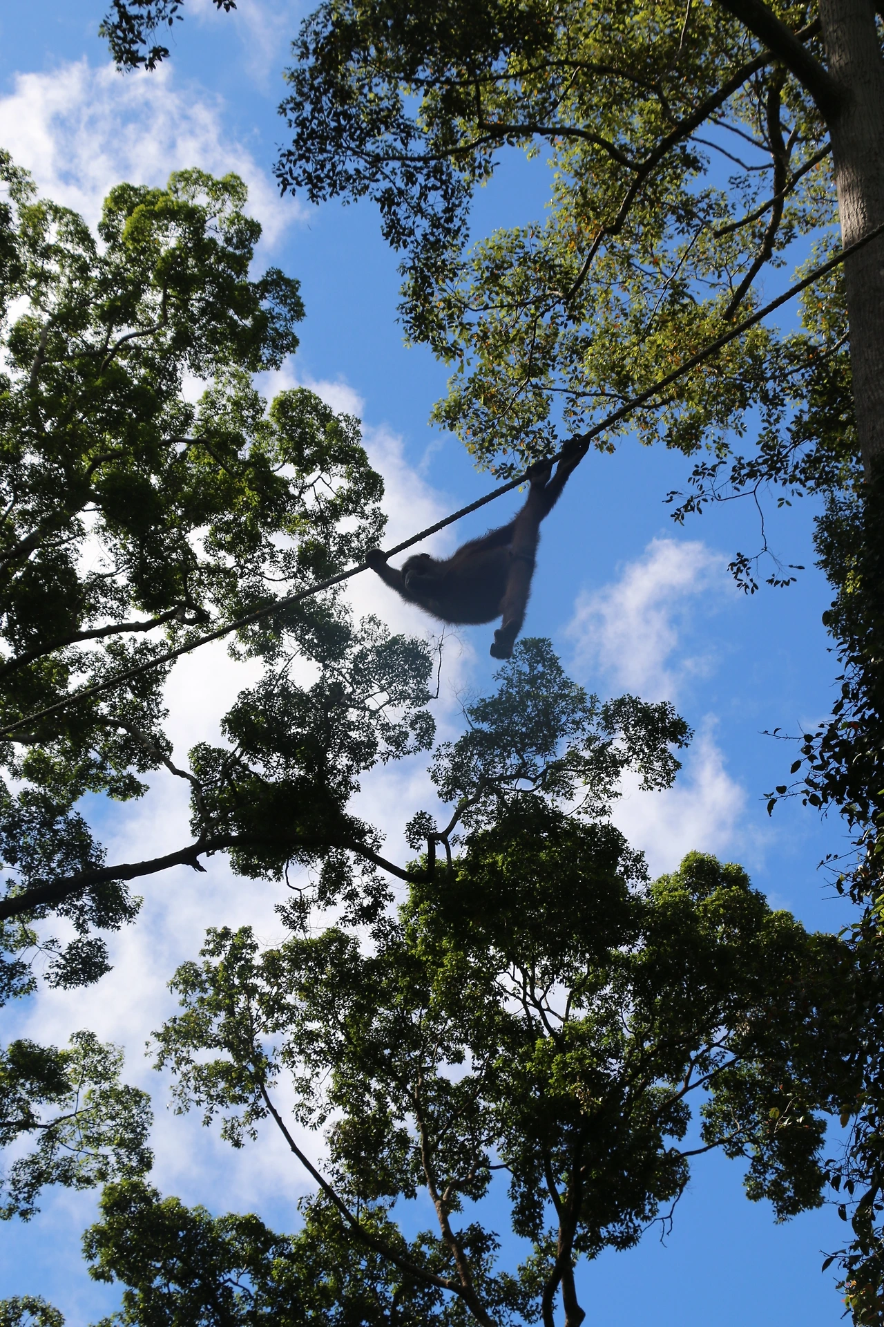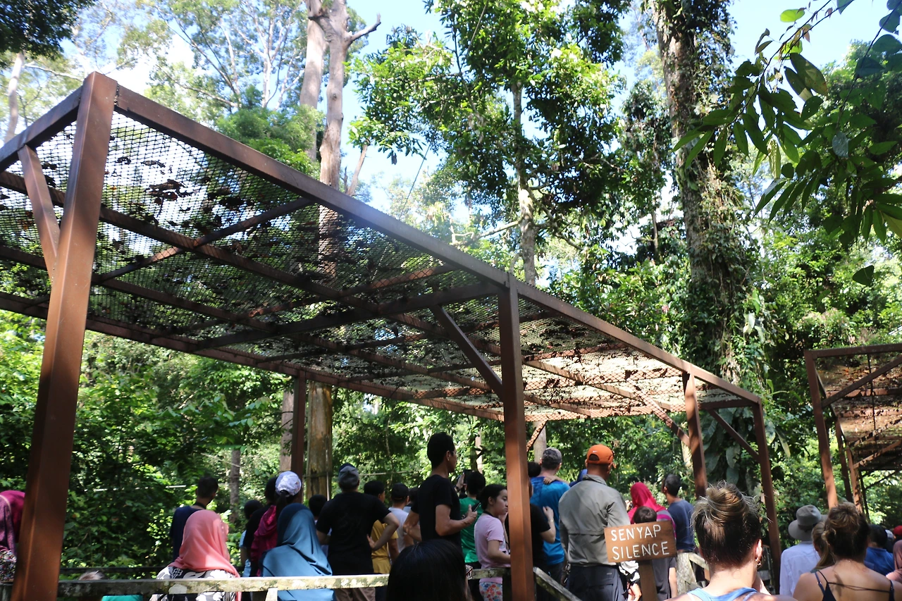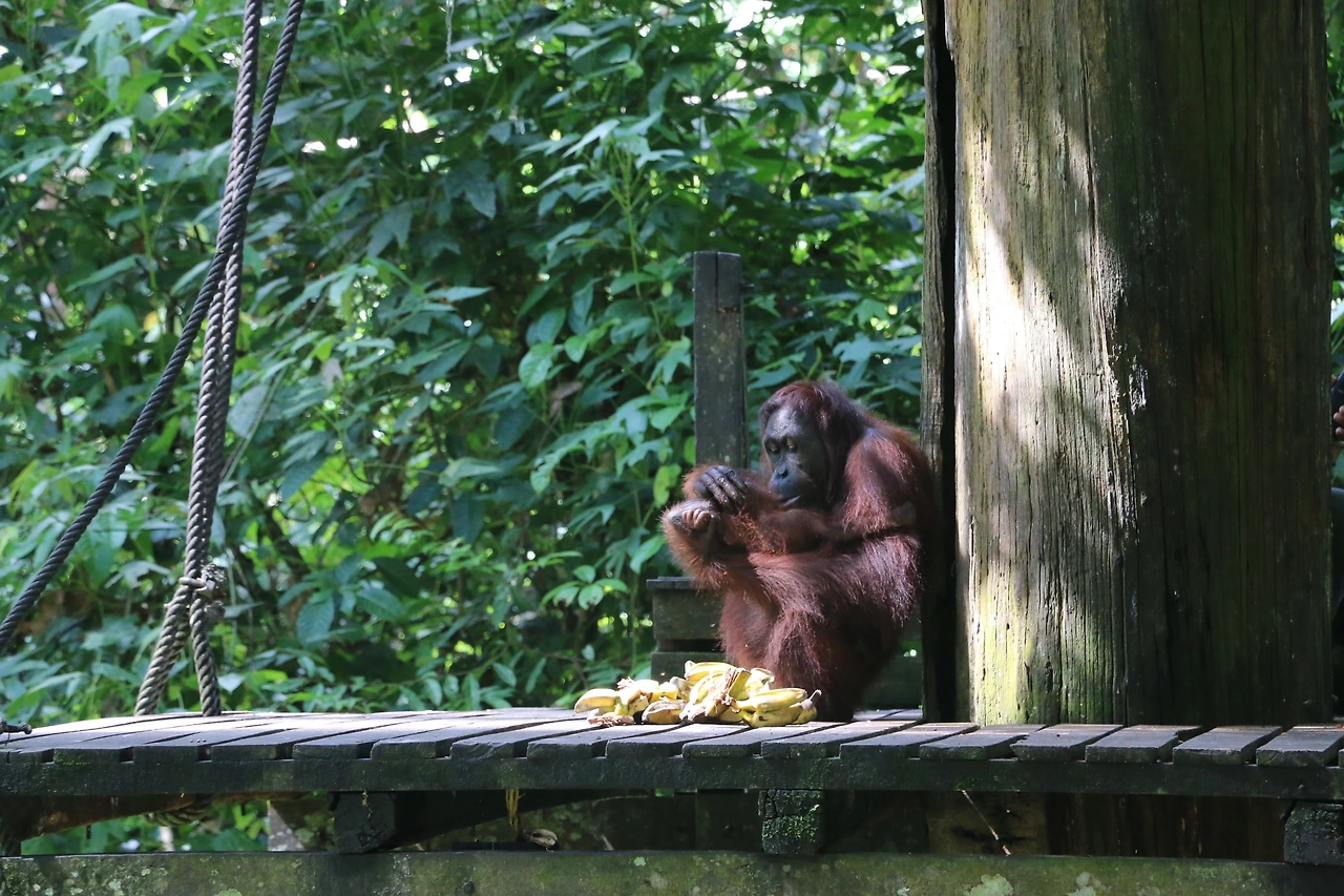 마침 먹이 주는 시간이 있어 그 모습을 지켜봤다. 먹이터는 사람들로부터 어느 정도 떨어져 있었다. 센터 내에 있지만 야생과 연결된 준방사(Soft-release) 지역이었다. 사육사가 바나나와 파파야를 들고 나왔다. 어미 오랑우탄 두 마리와 새끼 오랑우탄 여러 마리가 모여들었다. 사람들 머리 위로 밧줄이 있어 오랑우탄들은 자유롭게 매달려 돌아다녔다.