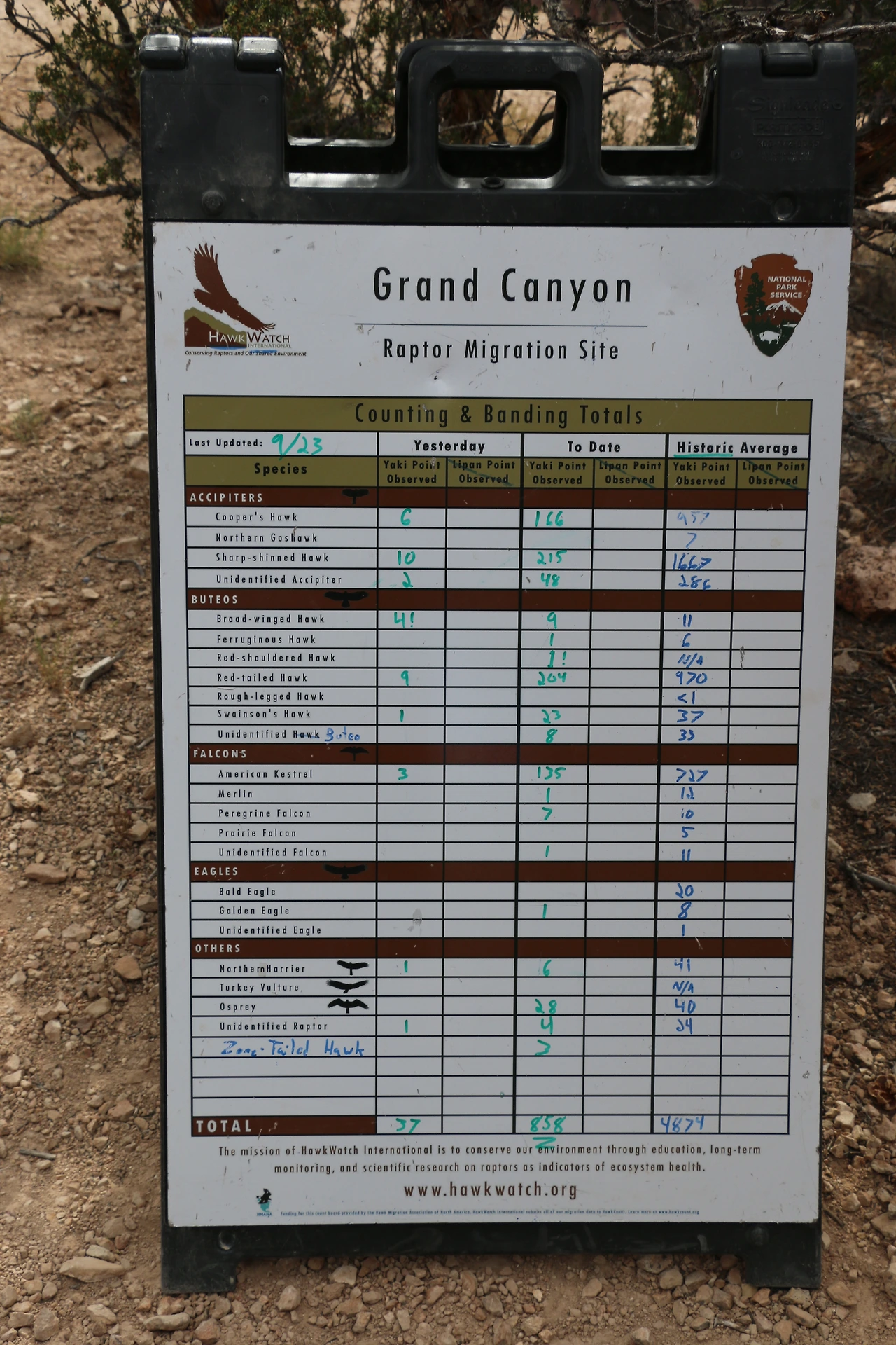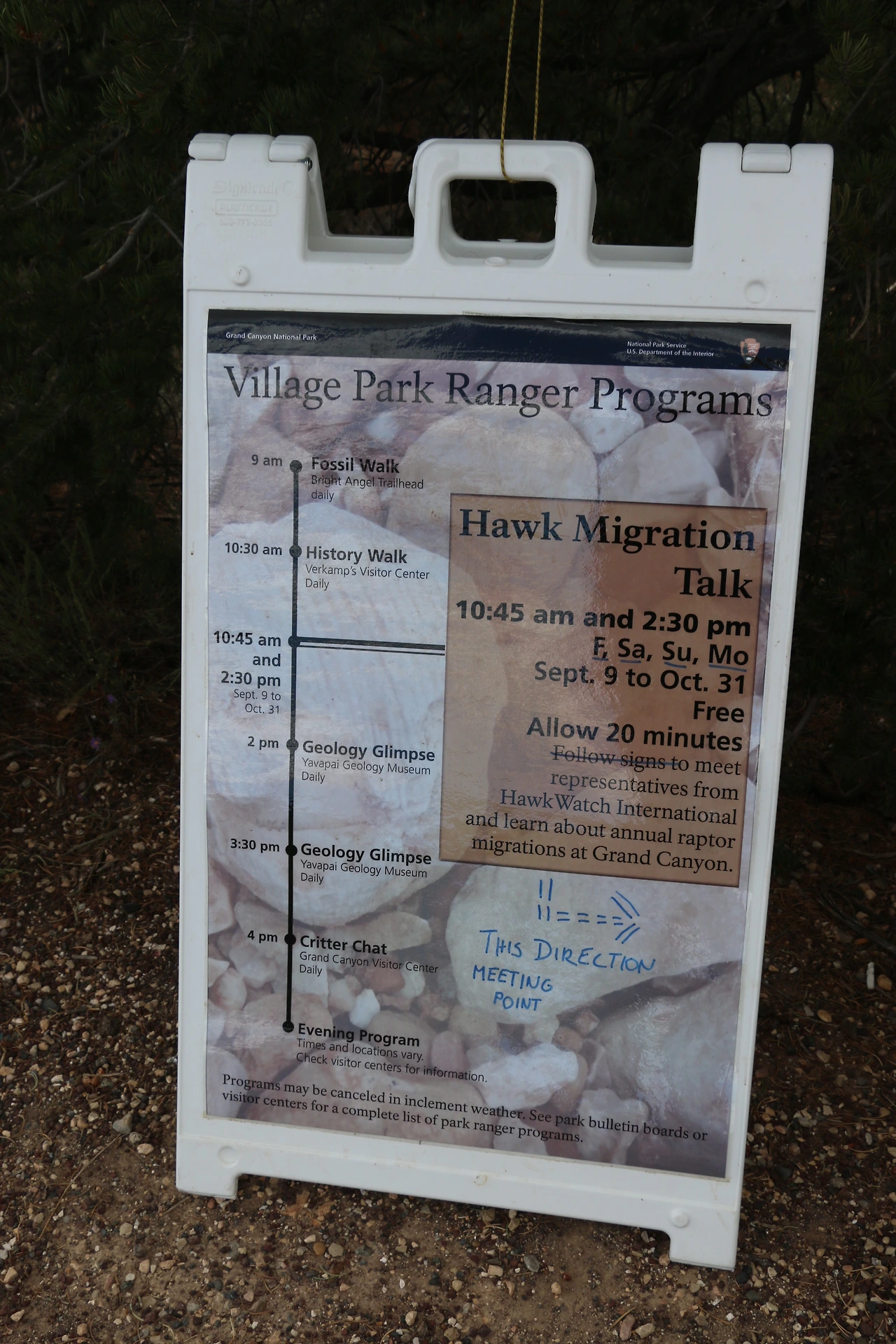 드디어 그랜드캐년이다. 이름도 그랜드. '웅장하다'는 뜻이다. 그랜드 피아노에서 나오는 선율처럼 흐른 콜로라도 강물과 땅, 바위가 합작하여 만든 협곡이다. 그 안에 90종이 넘는 포유류와 440여 종의 조류, 수백 종의 곤충과 거미 등 많은 야생동물들을 품고 있다. 그간 국립공원들을 거치며 많은 야생동물들을 봤지만, 엄청난 사람들이 찾는 관광지이기에 솔직히 큰 기대는 없었다. 좋다는 풍경을 따라 여유를 즐기던 첫날, 입간판 하나가 눈에 띄었다. 'Hawk Migration Talk.' 라니, 야생동물 냄새다!