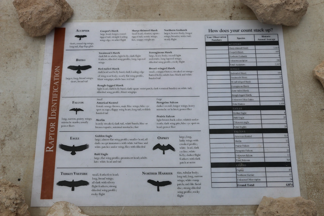 가장 많이 오는 손님은 줄무늬새매, 붉은꼬리말똥가리, 쿠퍼매다. 매, 물수리, 아메리카황조롱이, 검독수리도 온다. 이렇게 북미 하늘을 이동하는 맹금류의 존재는 100년 동안 알려져 있었지만 그랜드캐년 하늘 고속도로는 1987년에서야 주목을 받았다. 호크왓치가 1991년부터 2011년까지 관찰한 결과, 캐나다와 미국 서부에 걸쳐 그랜드캐년을 지나는 맹금류 수가 가장 많았다. 한 시즌에 10,000~12,000마리다.