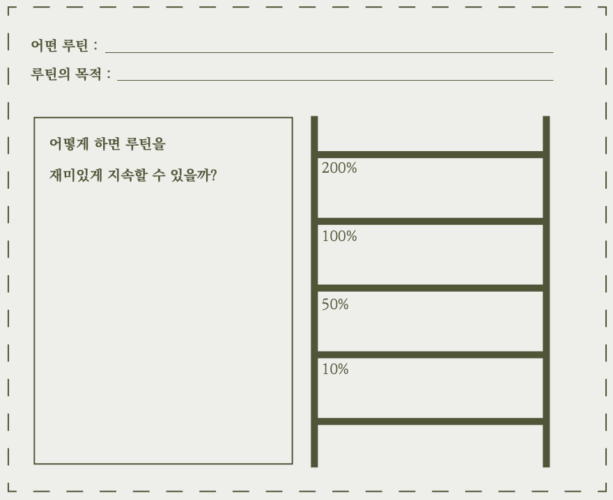 마지막으로 루틴 사다리를 만든다. 매일 실행하는 루틴에 실행 혹은 달성 단계를 만들어보는 거다. 10%는 어떤 변수가 생겨도 무슨 일이 있어도 달성할 수 있는 방법을 적어본다. 50%는 아쉽더라도 목표를 위해 최소한으로 실행하는 방법, 100%는 처음 생각했던 실행 방법, 200%는 이렇게 하면 정말 뿌듯할 거 같은 방법을 정해 본다. 원하는 정도가 아니더라도 스스로 루틴을 지켰다고 생각할 수 있는 방법을 미리 정한다.