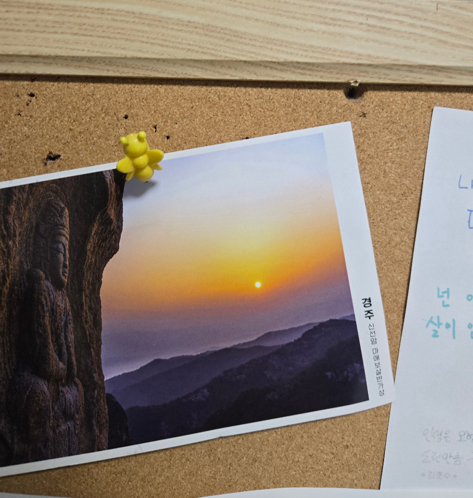 퇴근하고 집에 오는 길 늘 비어있던 우편함에 삐져나온 것이 보였다. 멀리 보이는 태양과 절벽에 새겨진 부처님이 찍힌 사진엽서였다.
