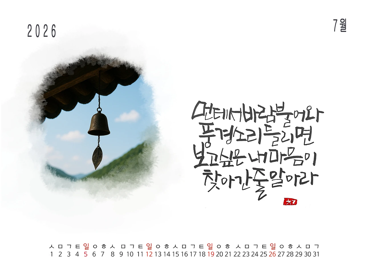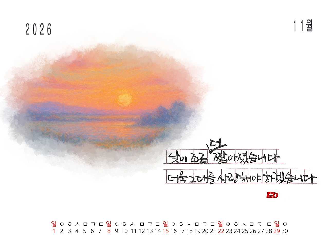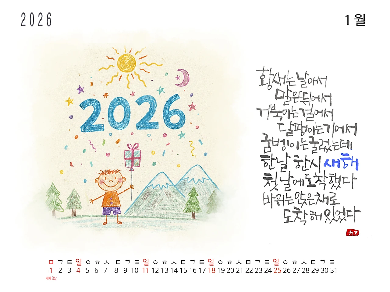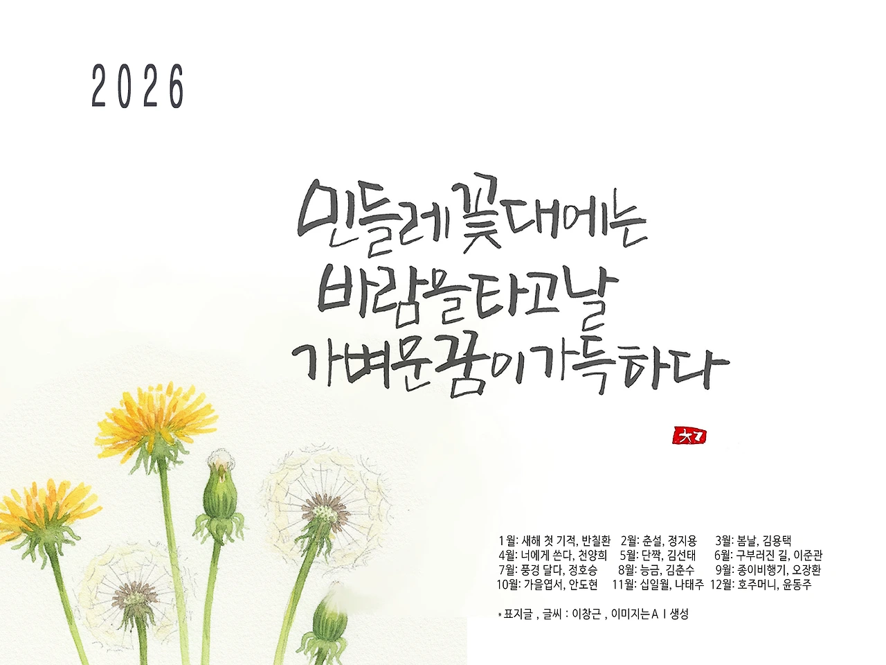 2026년 달력을 만들어 본다. 새해에는 좀 더 평화로운 세상이 되어가길 기대하며 각 달의 이미지에 적합한 시를 골라 글씨를 쓰고 Ai를 이용해 이미지를 만들어 본다. Ai이미지 생성은 처음 해보는 일이라 흥미로와 시간 가는 줄을 모른다.(아직 Ai창작물 생성에는 심리적 거부감이 있긴 하다)