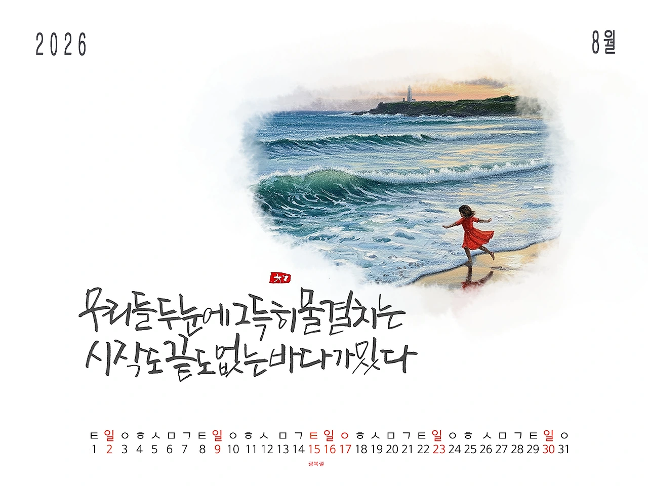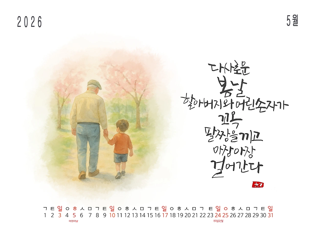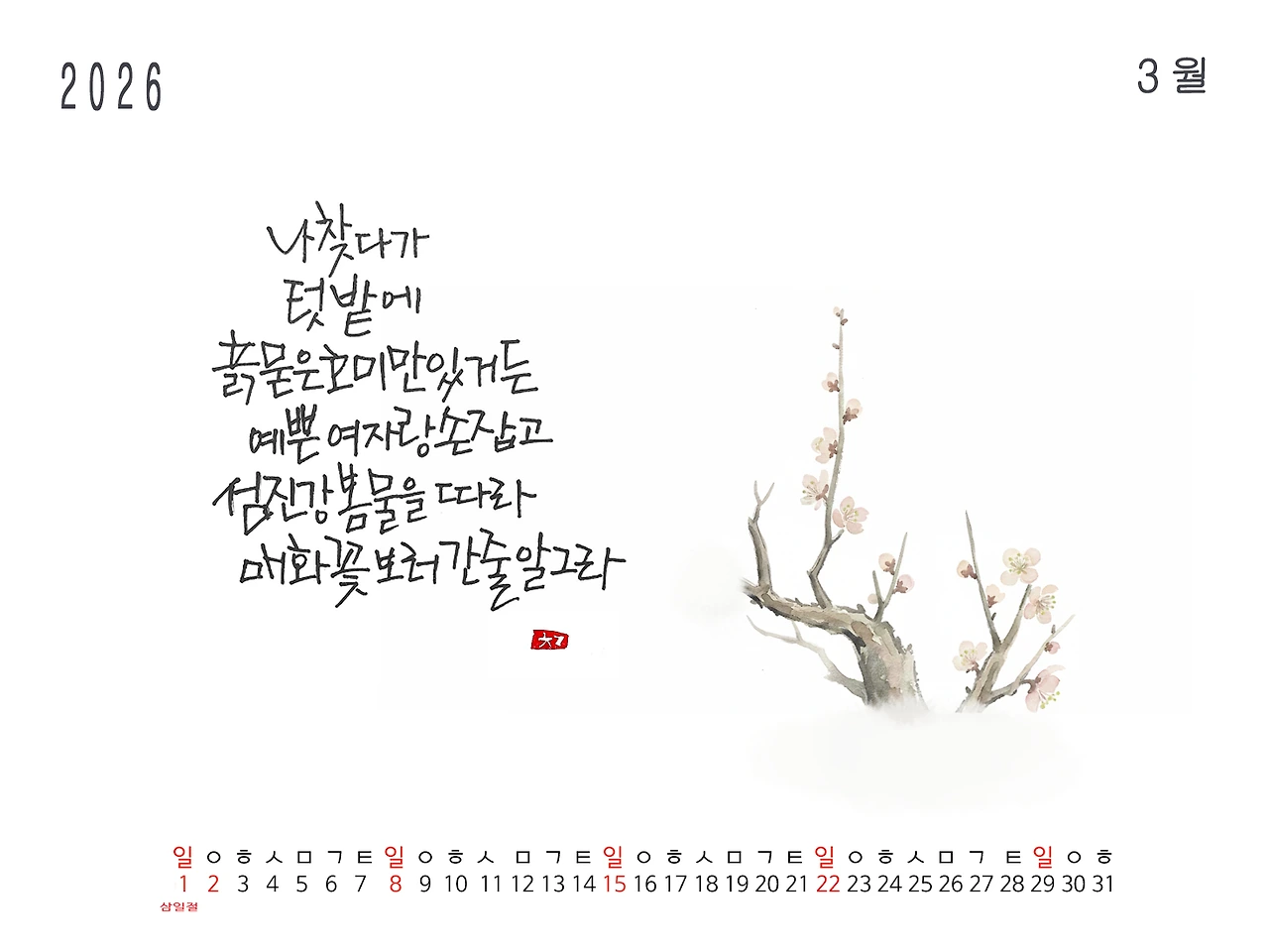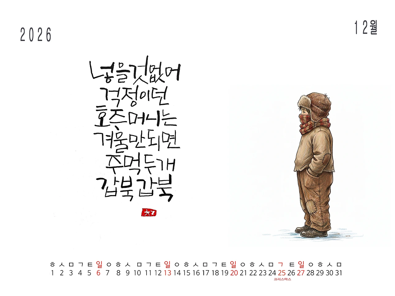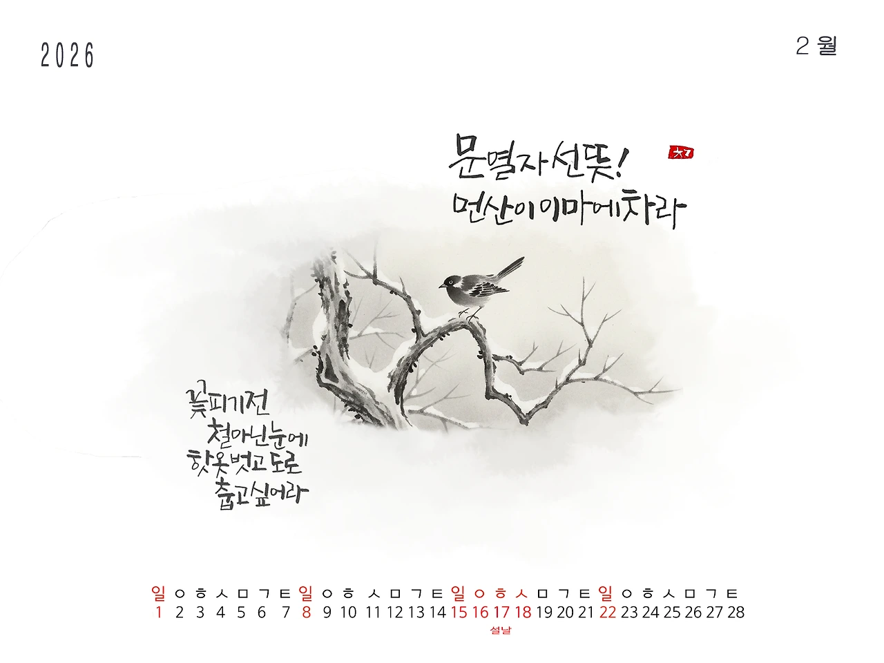 2026년 달력을 만들어 본다. 새해에는 좀 더 평화로운 세상이 되어가길 기대하며 각 달의 이미지에 적합한 시를 골라 글씨를 쓰고 Ai를 이용해 이미지를 만들어 본다. Ai이미지 생성은 처음 해보는 일이라 흥미로와 시간 가는 줄을 모른다.(아직 Ai창작물 생성에는 심리적 거부감이 있긴 하다)