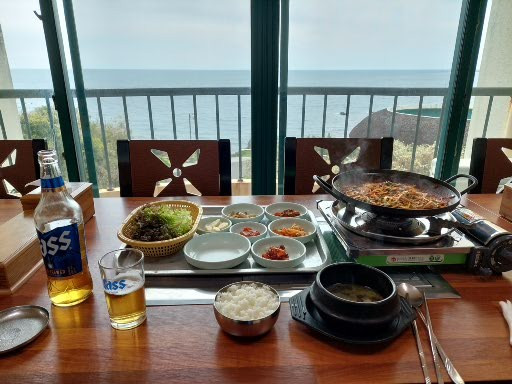 그래 아침부터 부지런히 걸은 나를 위해 먹고 싶었던 두루치기와 맥주를 시켜 먹으니 맛도 좋거니와 늦게 먹는 식사의 행복감이 밀려오는데, 앞을 보니 바다 전망도 좋은 곳이었다. (ㅋㅋ오전 내내 바다를 보며 걸었는데~ )