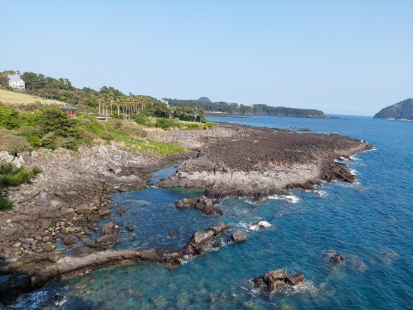 섶섬이 손에 잡힐 듯이 보이는 제지기오름을 지나 검은여를 지날 때는 앞에 보이는 주상절리 절벽을 참 멋있게 솟아 있다고 생각하면서 걸었는데, 그 주상절리 언덕 위에서 걸음을 멈추고 돌아보니 검은여와 그 옆으로 걸어 지나온 푸른 길이 천국 같은 평온한 느낌의 아름다움을 보여준다. 길은 이렇게 돌아서 봐야 그 진면목을 보여 줄 때가 많다. 우리네 삶도 그렇듯.