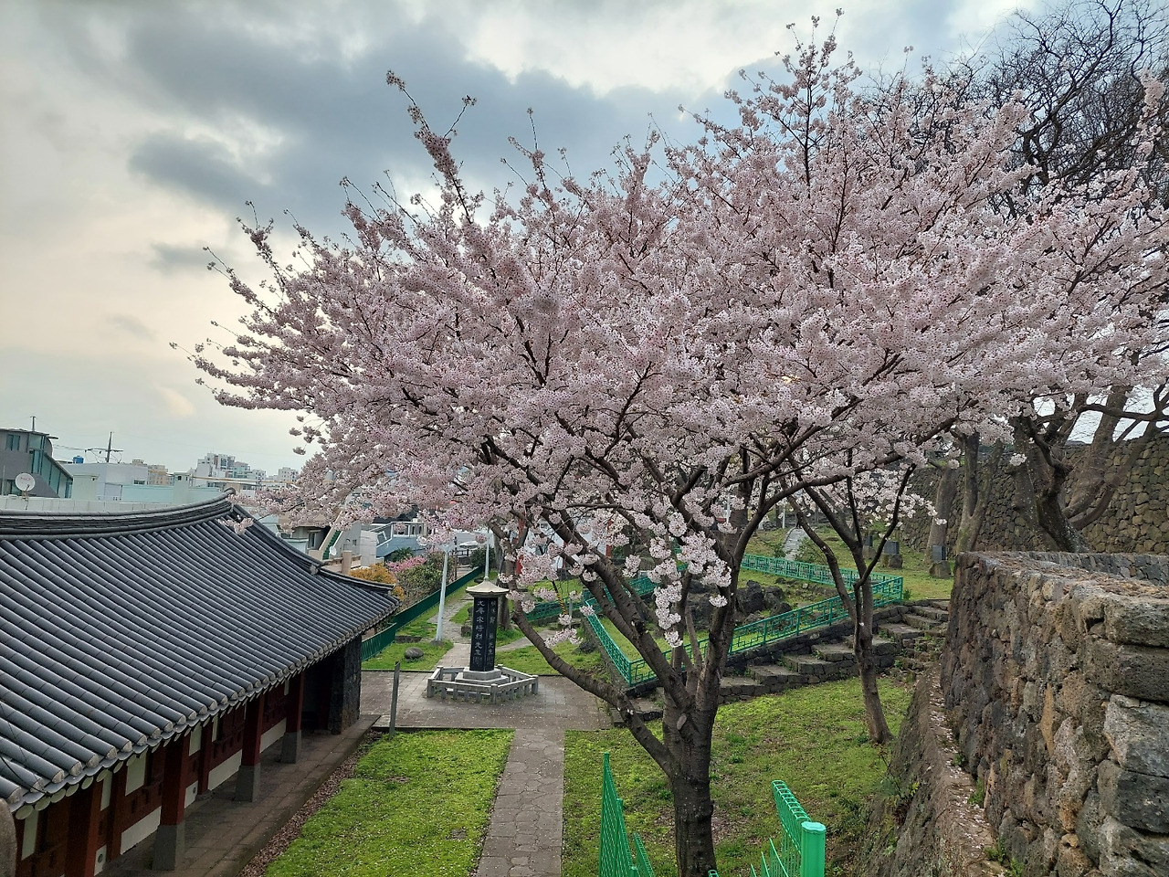 넓은 도로를 건너 분위기 좋은 사당을 만나 기분이 좋았다. 아침 밝은 분위기와 어울리게 벚꽃 두 나무가 나란히 꽃잎을 가득 이고 서 있다. 사전에 알지 못했던 장소라 살펴보니 오현단이라고 한다. 제주 교학 발전에 공헌한 오현을 배향했던 장소인데 송시열의 비석을 보며 감흥이 훅 줄어들었다. 노론에 대한 부정적 이미지를 강하게 가지고 있어서, 그냥 분위기만 멋진 곳으로 기억하고 지나가자 하고 생각하고 지나간다.