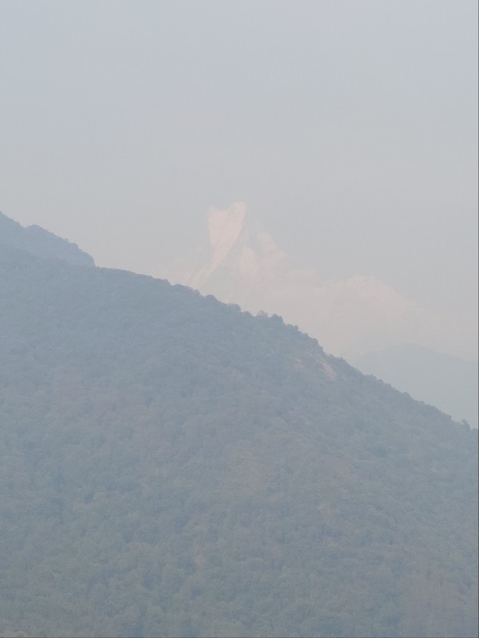 한바탕 쏟아 붓던 빗줄기가 잠시 소강 상태를 보이더니 산너머로 흐릿하게 마차푸차레의 모습을 보여준다. 새벽에 푼힐에 일출을 보러가서 보고 싶은 봉우리 였으나 구름에 가려 볼 수 없었기에 저만큼이라도 보는것에 반가운 마음이 둔다.