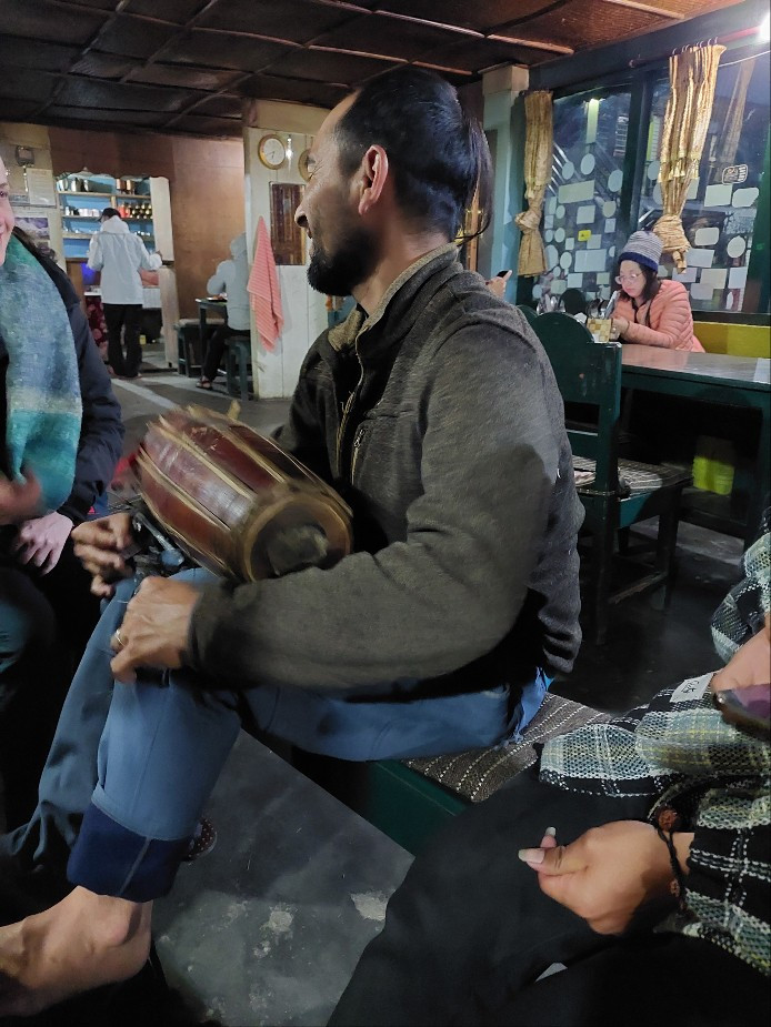 그리고 연주를 하는데, 하! 이건 속았네. 그냥 뚱땅거리며 시시덕거리는~. 그러자 여기저기서 서로 그냥 한 번씩 만지고 돌아가며 뚱땅거리다가 나에게도 한번 쳐보라고 건넨다. 그래도 건너편에 앉은 가이드 한 명이 제대로 두드리며 노래를 하니 민요 풍의 노래를 가이드들이 따라서한다. 난로 주변으로 가이드들과 트래커들이 모여 왁자지껄해지자, 먼 길 돌아오게 된 동네 사랑방 같은 훈훈함이 느껴진다.