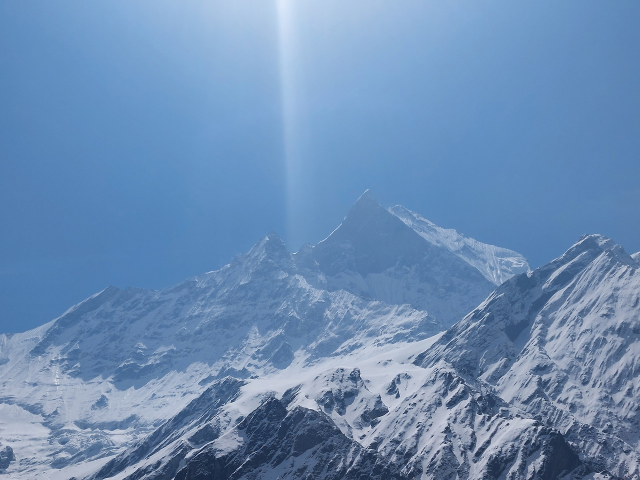 MBC에 도착을 했다. 마차푸차레, 네팔인들의 신성한 경의를 받고도 남을 만한 엄청난 위용이다. 봉우리 끝이 갈라져 있는 것처럼 보여 물고기 꼬리 같다는 의미를 가지고 있어 피쉬테일이라고도 불리는 마차푸차레는 힌두교의 비슈누신이 현현한 두 형제라고 여겨져 신성시되고 있어 등반이 허용되지 않는 곳이라고 한다.