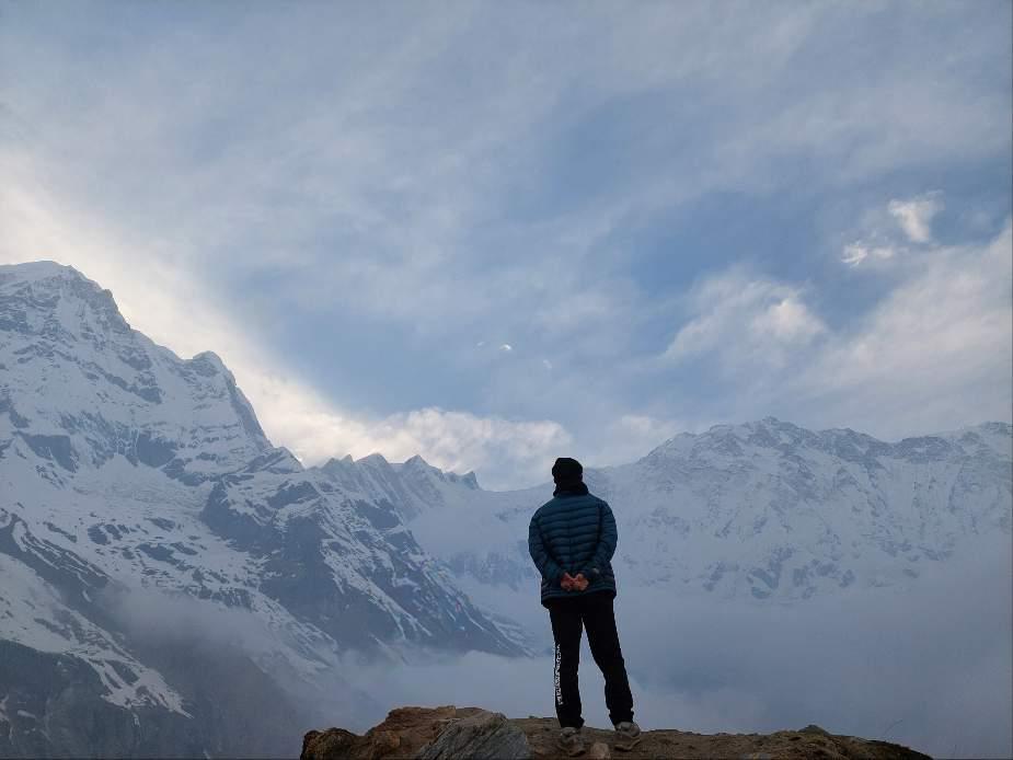 구름이 걷히면서 제 모습을 거의 온전하게 드러낸 안나푸르나. 오늘은 행운이 깃든 날이다. 사진 찍고 잠시 감상하는 사이 안개구름이 몰려오더니 순식간에 사방의 봉우리들을 다 감추고 만다.