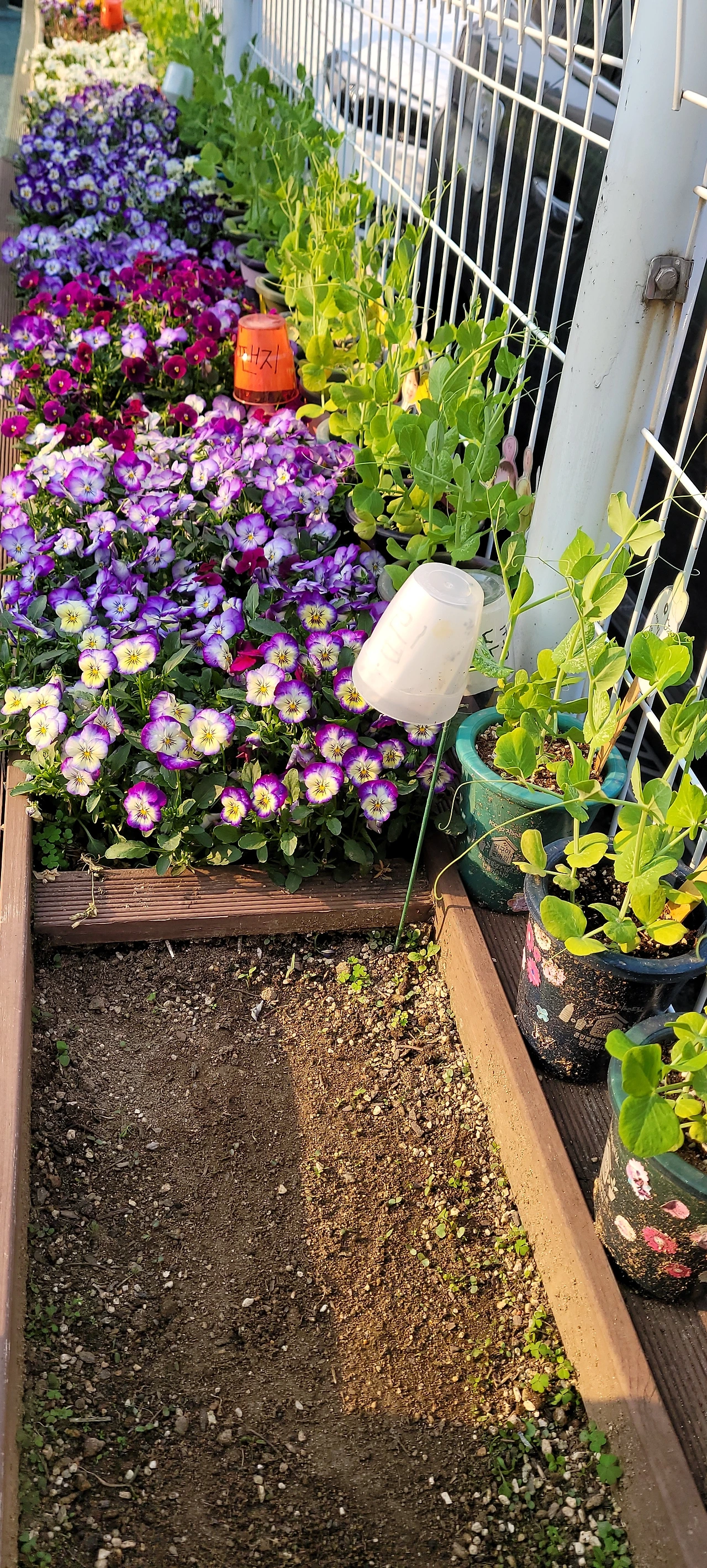아이와 집에 오는 길, 어린이집 담벼락에서 아이 이름을 단 완두콩을 구경하다가 꽃들이 예뻐 한참을 서있었다.