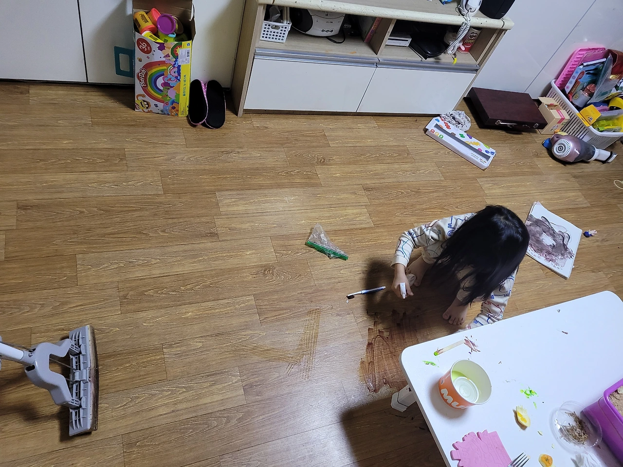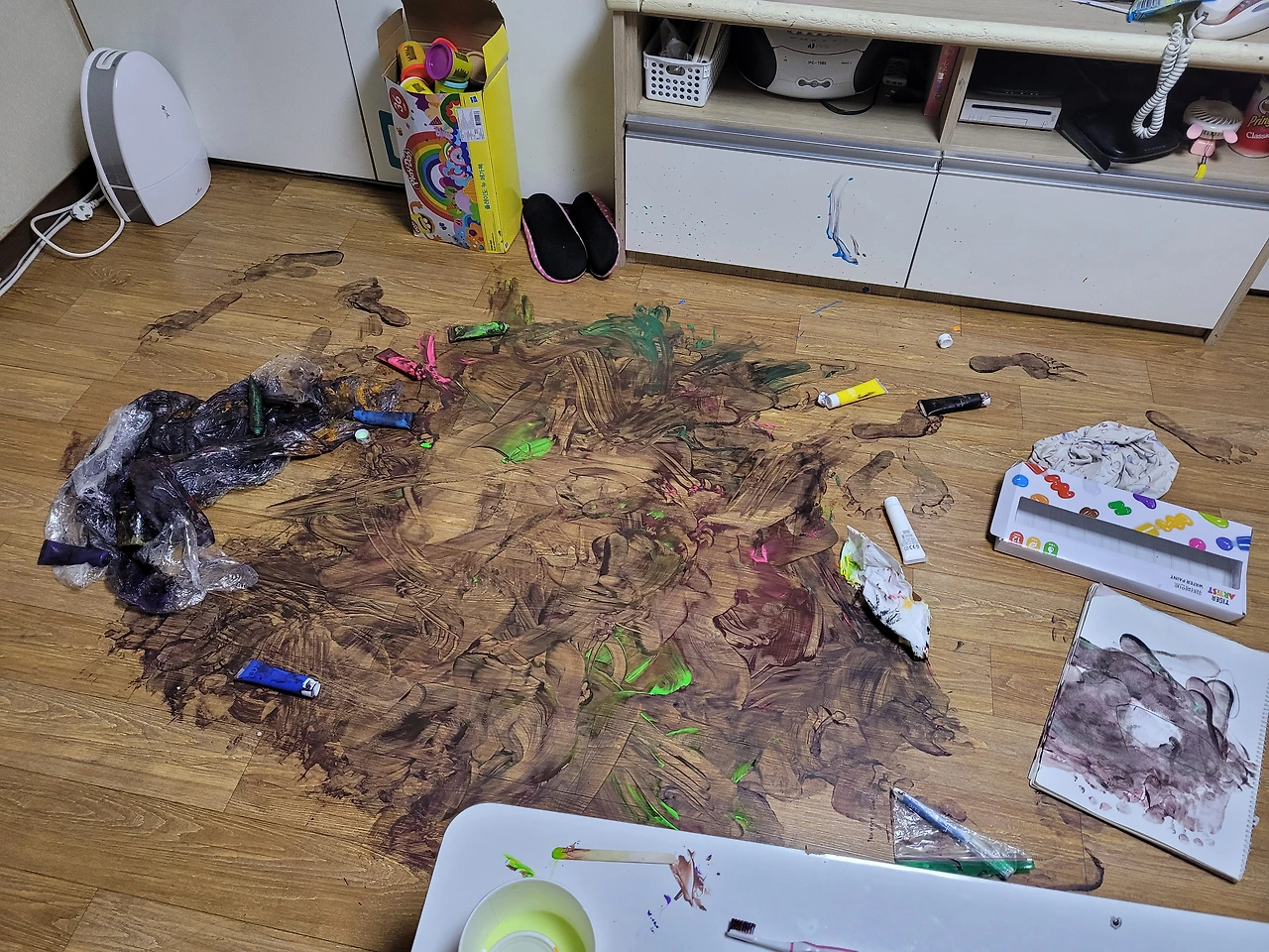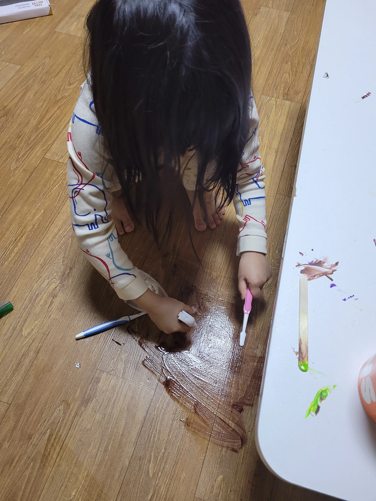 엄마, 물감 지우는 법을 알았어, 칫솔로 하니까 잘 지워진다! 이제 바닥에 맘껏 그림을 그려도 괜찮아!지우는 방법을 아니까!