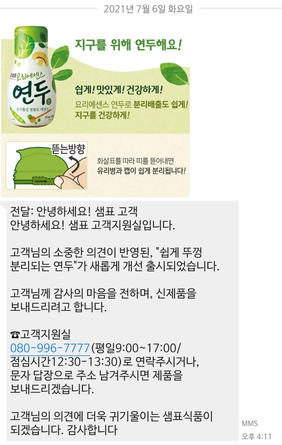 내가 낸 의견에 따라 용기가 바뀐다는 것이다. 그리고 고마운 마음에 선물도 보내준다고 했다. 난 문자를 보고 정말 기뻤다. 선물이 온다는 것 때문이 아니었다. 내 의견이 받아들여졌고 앞으로 달라진 용기의 제품이 판매될 것이며 환경을 지키는데 내가 기여할 수 있게 됐다는 점 때문이었다. 본사에 내 의견을 올려 준 서비스센터 직원도 고마웠다. 샘표에서 광고비를 받은 것도 아니고 가족이 일하는 것도 아니지만 앞으로 잘 됐으면 좋겠다고 잘될 거라고 빌어주기까지 했다.
