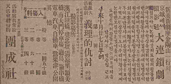 연쇄극이란 무대에서 도저히 재연할 수 없는 장면을 필름으로 찍어 막과 막 사이를 연결시키는 것이었으니, 영화라고 할 수는 없다. 여하튼 김도산의 최초의 시도 연쇄극 <의리적구토>가 그해 10월 27일 단성사 무대에서 선을 보였다. 막대한 제작비로 완성된 이 작품은 선풍적인 인기를 모으게 됨에 연쇄극 붐을 형성하게 됐다.